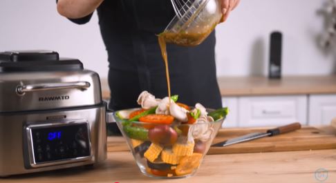 1. Смешайте растительное масло, оливковое масло, бальзамический уксус, сок лимона, рубленый чеснок, розмарин, соль и черный перец.