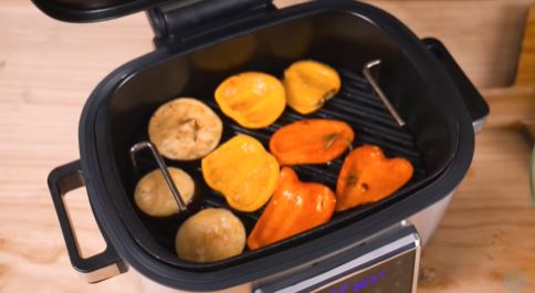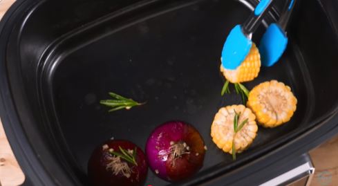 1. Поместите лук и кукурузу на нижний слой аэрогриля, сверху добавьте остальные овощи.