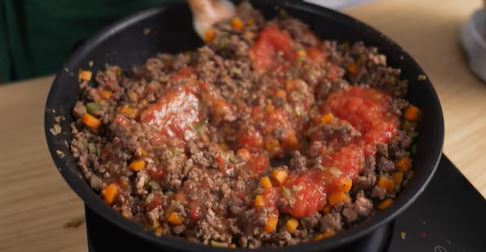 5. Добавьте фарш, томатный соус, специи и воду. Томите 30–40 минут.