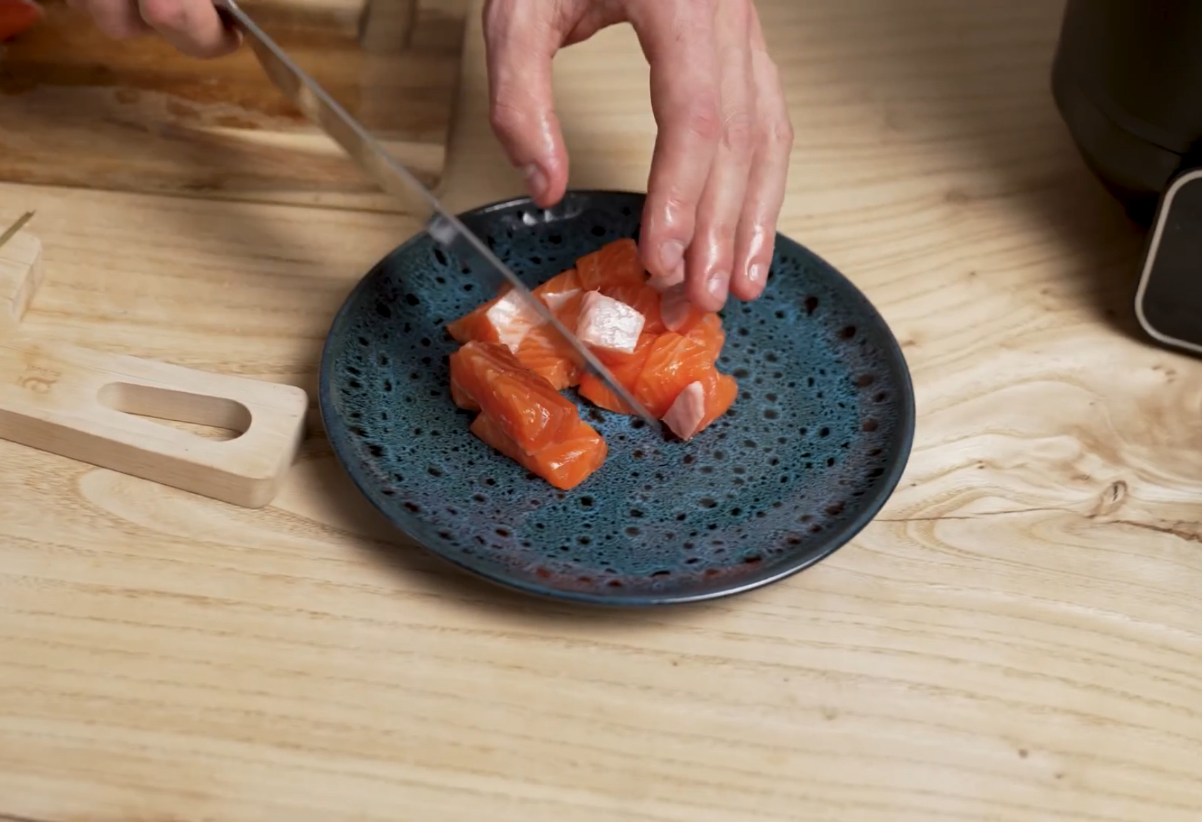 1. Нарежьте лосось на кубики.