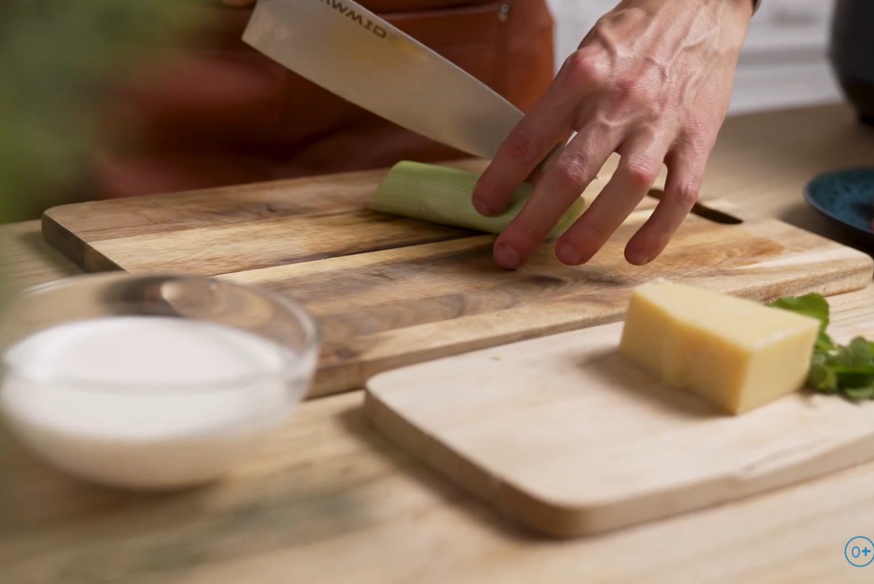 2. Лук-порей нарежьте пополам и порежьте полукольцами.