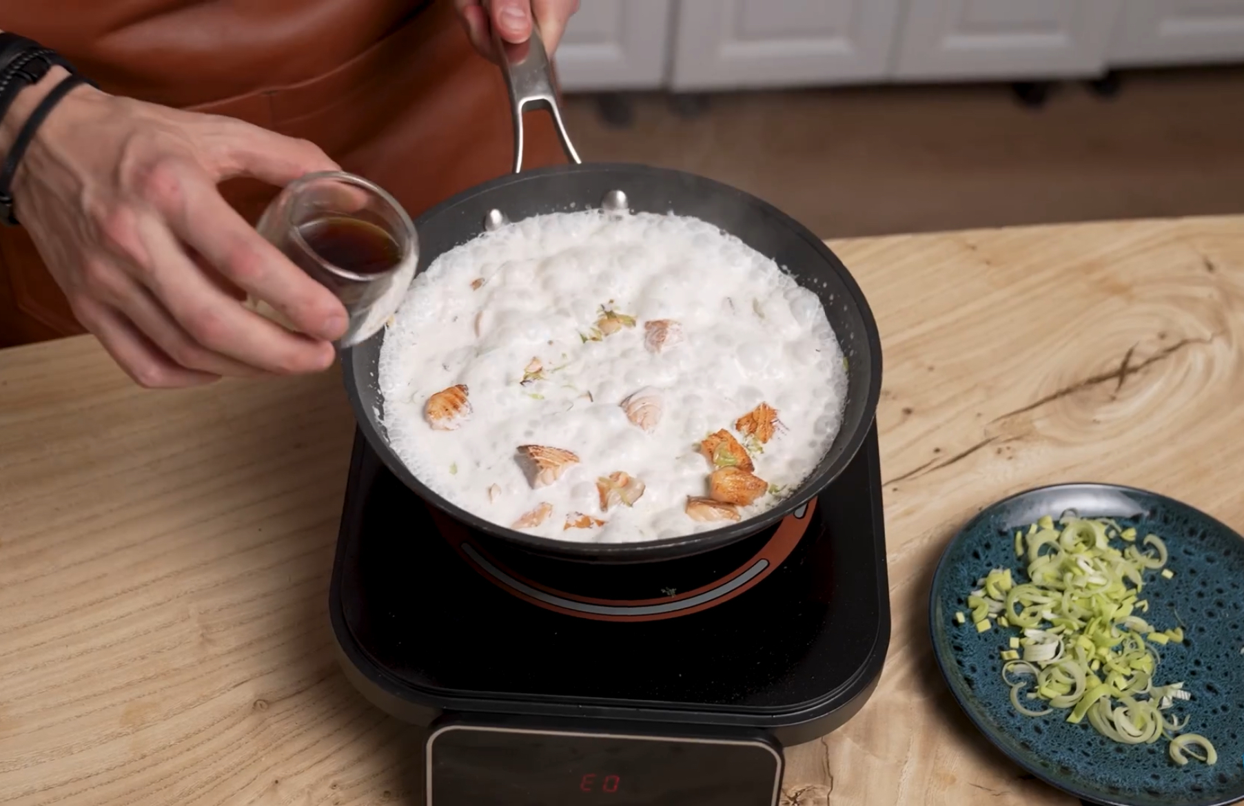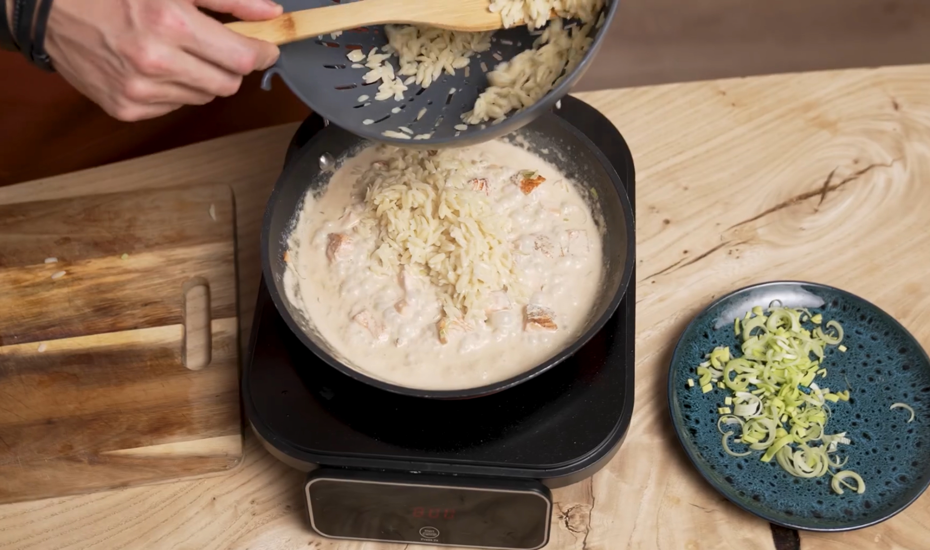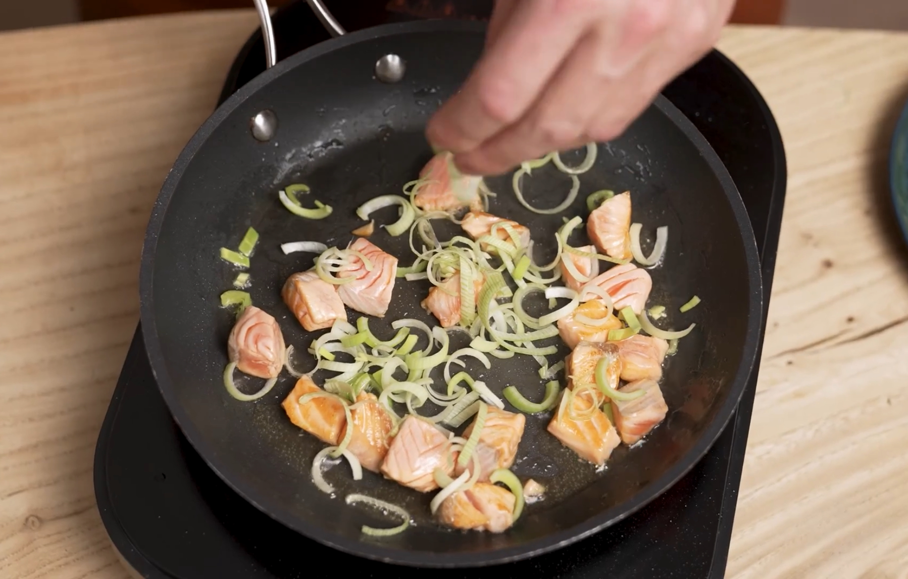2. Обжарьте лосось несколько минут, затем добавьте лук-порей и жарьте ещё 2-3 минуты.