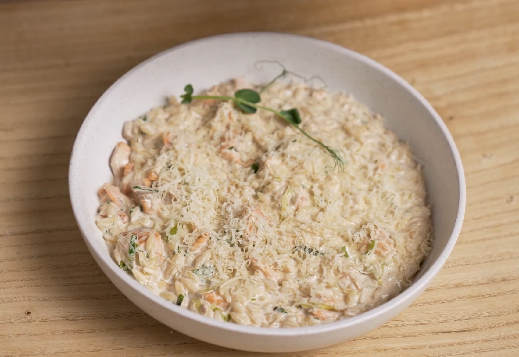 Паста орзо с лососем, сливками и кофейным соусом