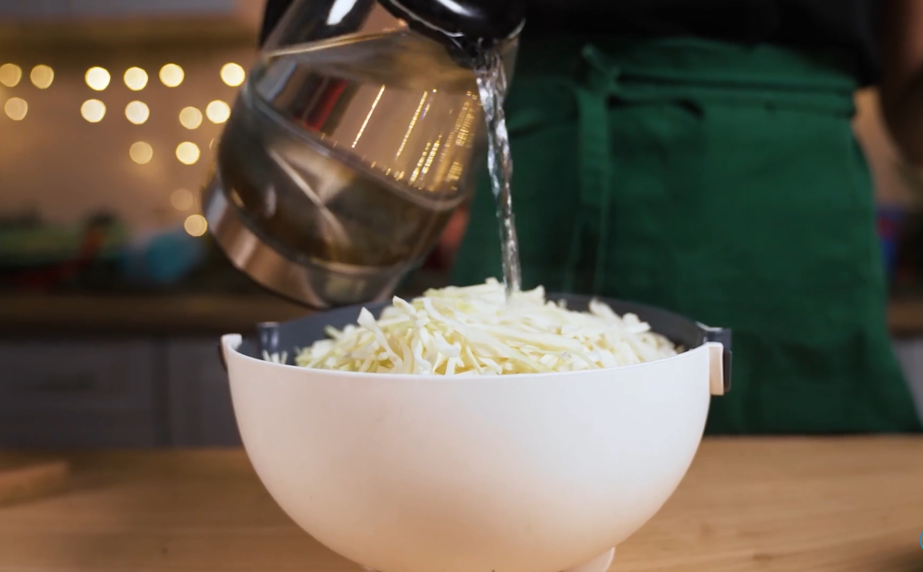 2. Нарежьте капусту и залейте кипятком на несколько минут, чтобы убрать горечь. Промойте холодной водой.
