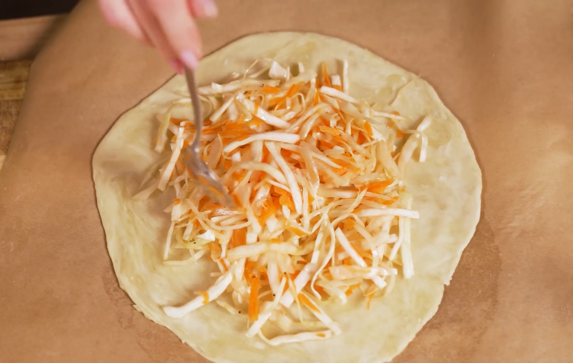 3. Распределите начинку и накройте верхним слоем теста, защипнув края.