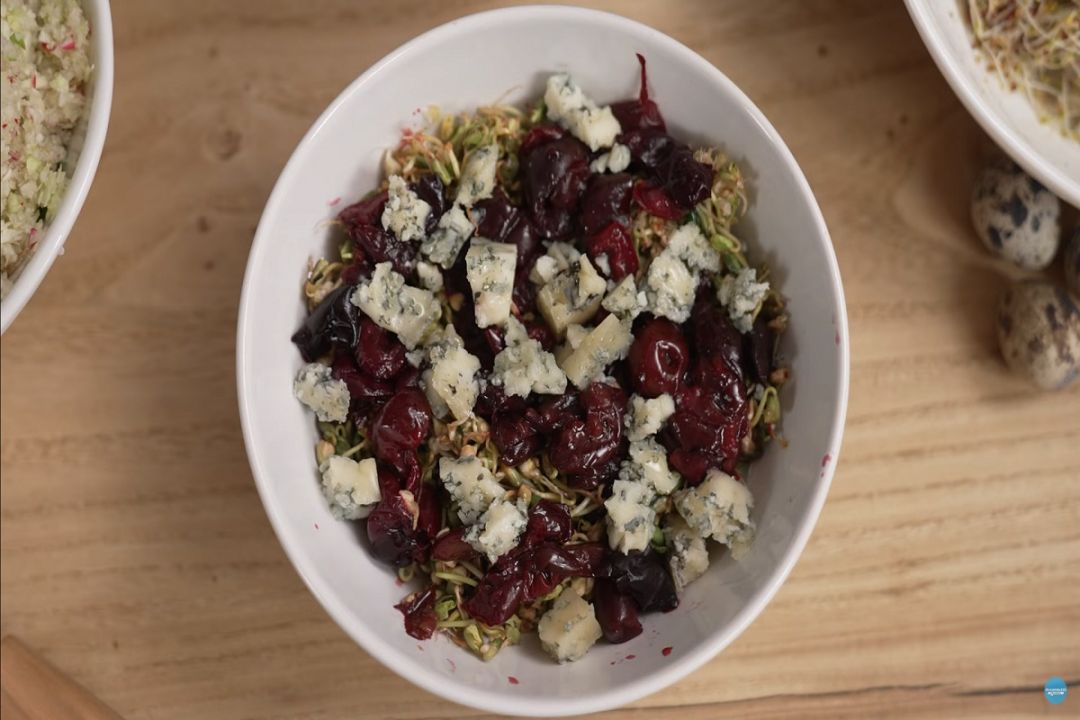 1. Гречка и вишня: промойте проростки, обсушите. В миске смешайте их с вишней.