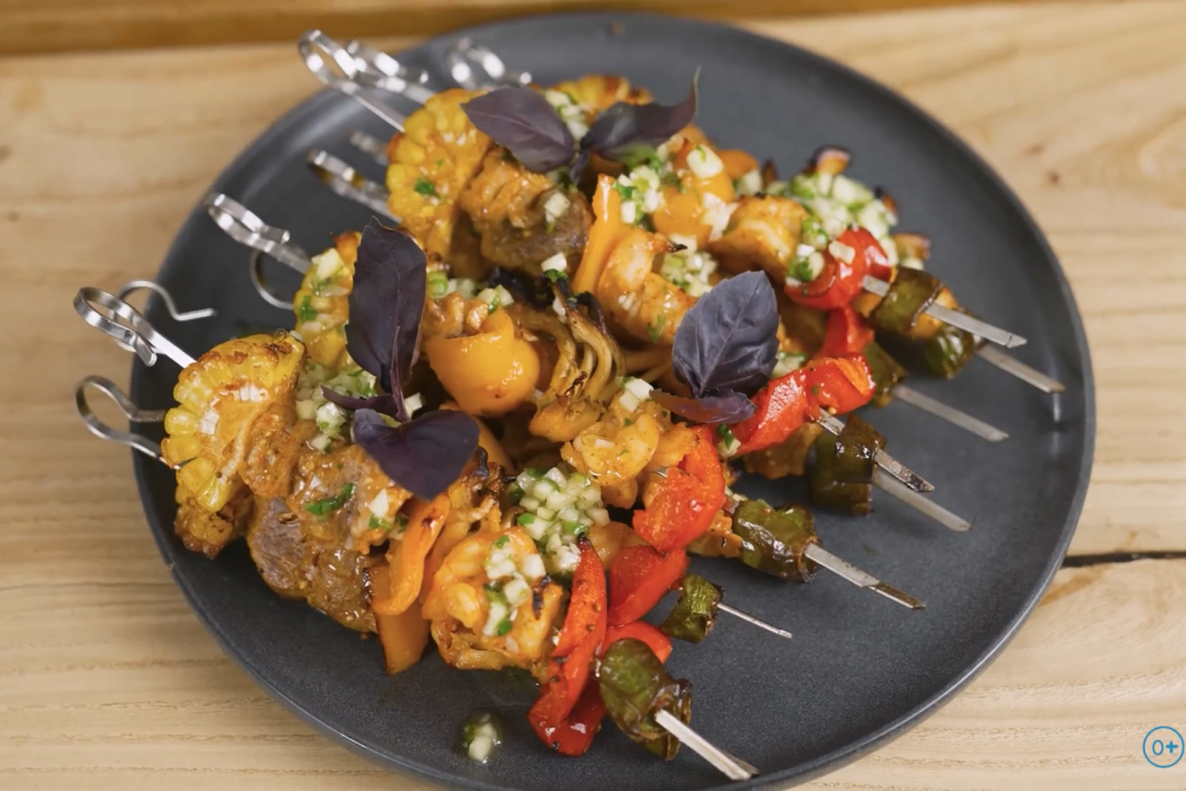 4. Наденьте ингредиенты в произвольном порядке на шампуры и готовьте в аэрогриле или шашлычнице.
