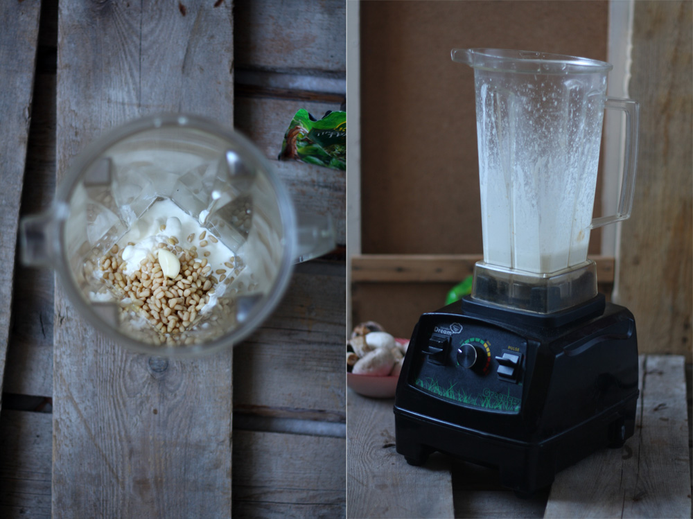 2. Готовим орехово-сметанный соус. Орехи, сметану, 2 очищенных зубчика чеснока, прованские травы и немного соли,