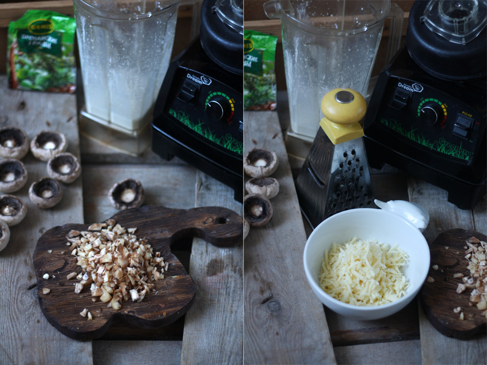 1. Подготовим ингредиенты на 4 порции. Шампиньоны очистим от кожицы. Духовку разогреваем до 180С.