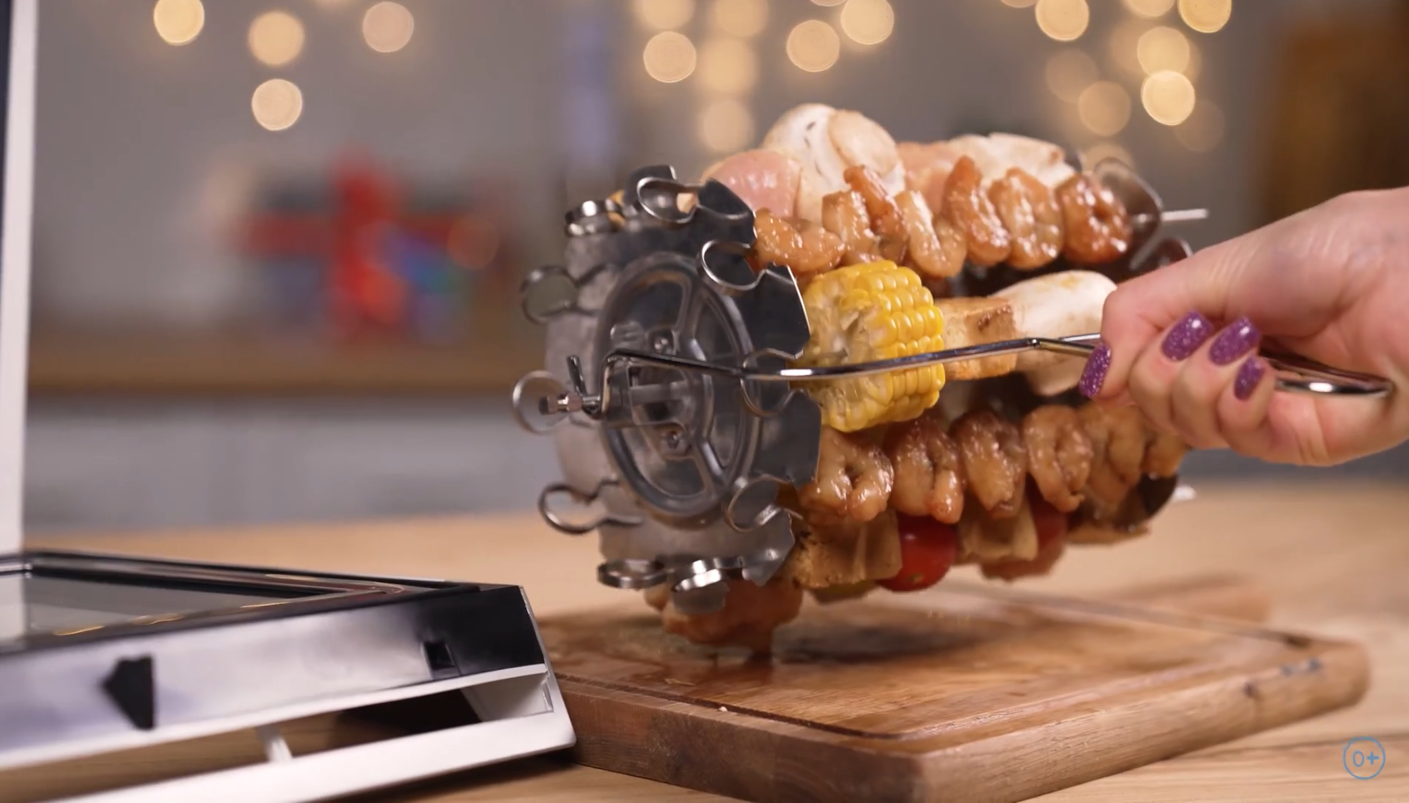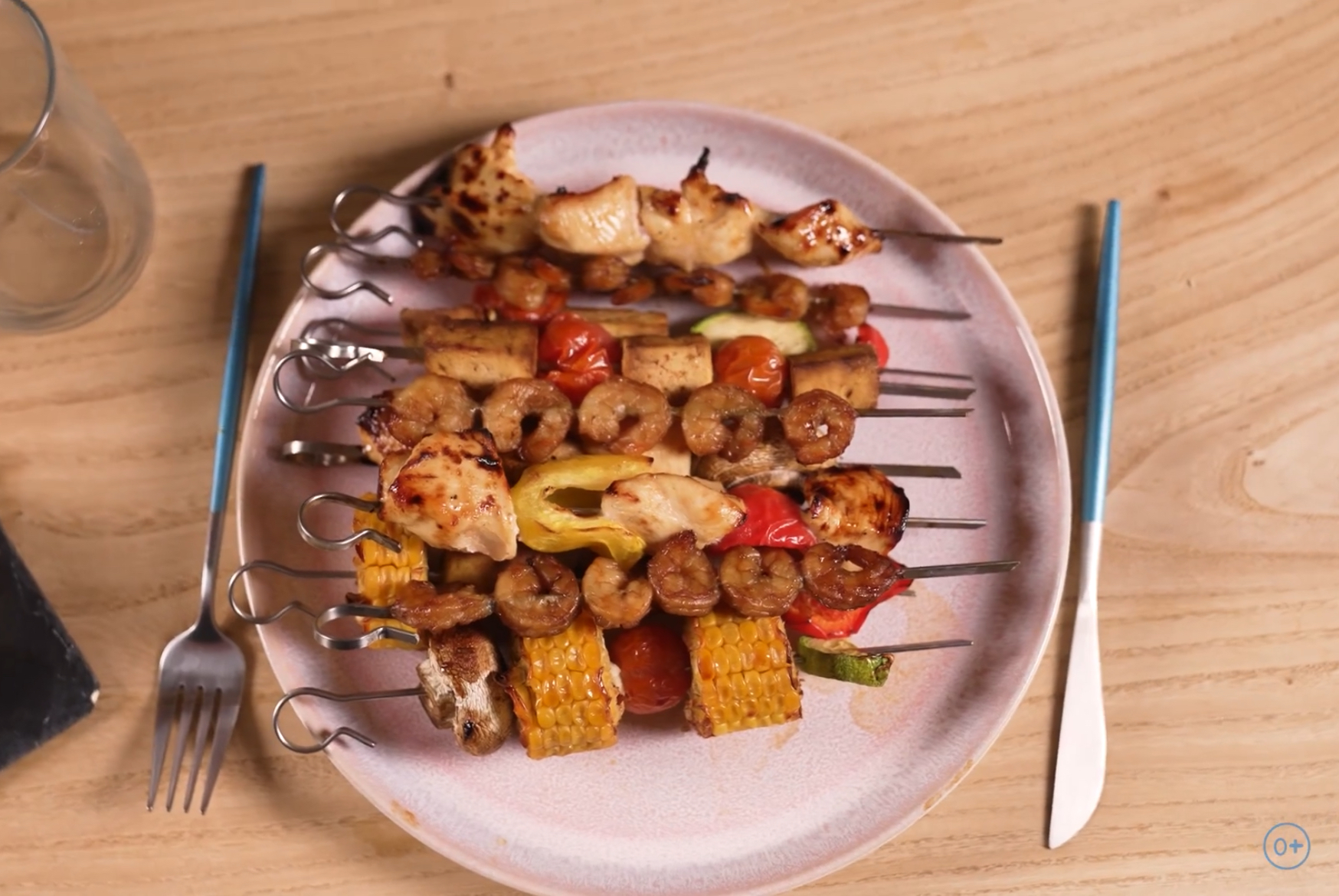 Шашлычки к новогоднему столу включают три варианта: куриные, из креветок и тофу с овощами. Каждый вид готовится с уникальным маринадом: курица — с медом, горчицей и специями; креветки — с соевым соусом, цитрусовыми и чесноком; тофу — с соевым соусом, оливковым маслом и специями. Ингредиенты нанизываются на шампура и запекаются в аэрофритюрнице. Это универсальное блюдо подходит и для мясоедов, и для вегетарианцев.