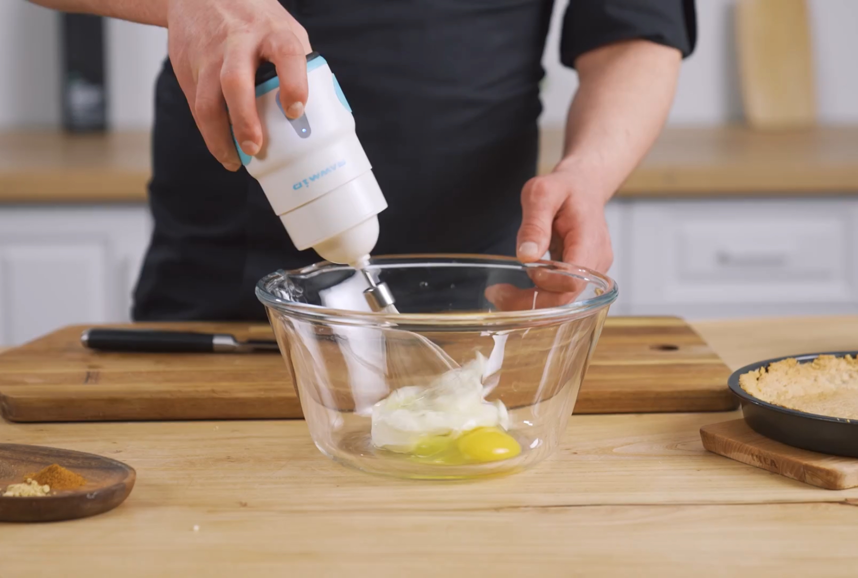 Смешайте сливочный сыр с яйцом, добавьте специи, чеснок и авокадо. Перемешайте.