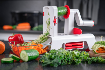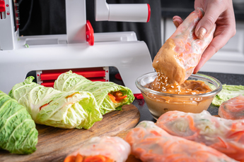 1. В спиралерезке Zoodler 2 RZS-03 выбираем насадку для крупной лапши и среднюю толщину нарезки.