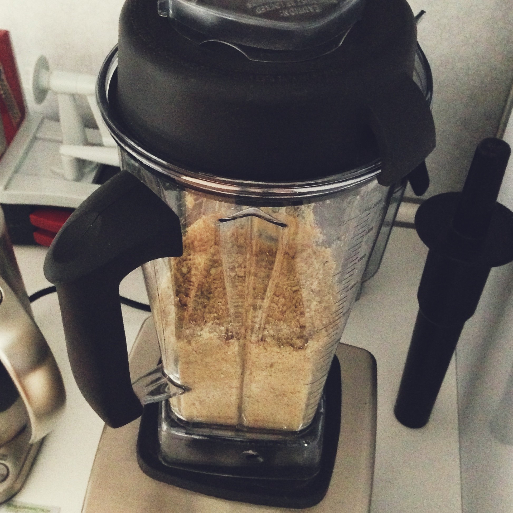 2. Лен (сухой) измельчить в блендере в муку; большую часть выложить в замесочное блюдо и отставить в сторону, немного оставить (2-3 столовые ложки - она понадобится, когда будете скатывать из теста шарики).