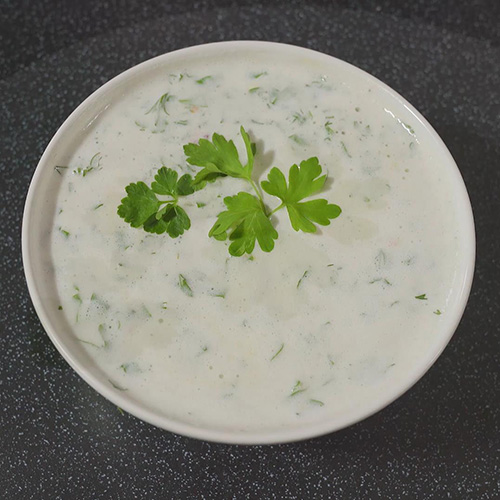 7) Смешайте все ингредиенты. Долейте воды, чтобы добиться консистенции супа. Вкус можно регулировать разными пропорциями чеснока, специй и лимонного сока. Окрошка готова.