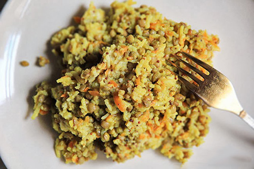 4) Добавляем рис и проростки маша, ждём полминуты.
