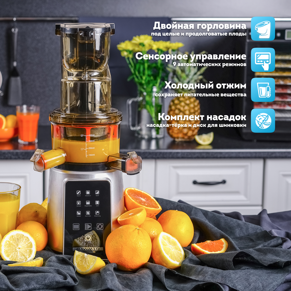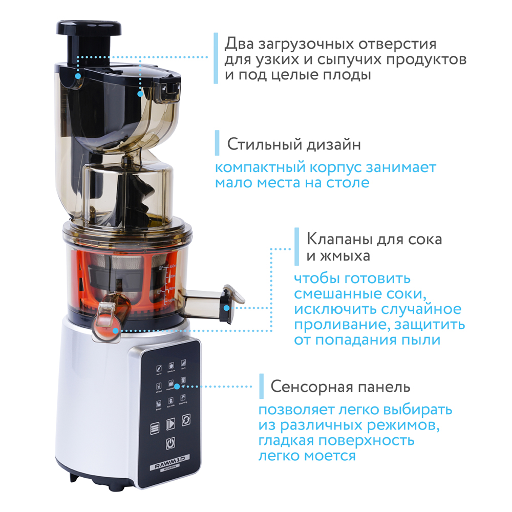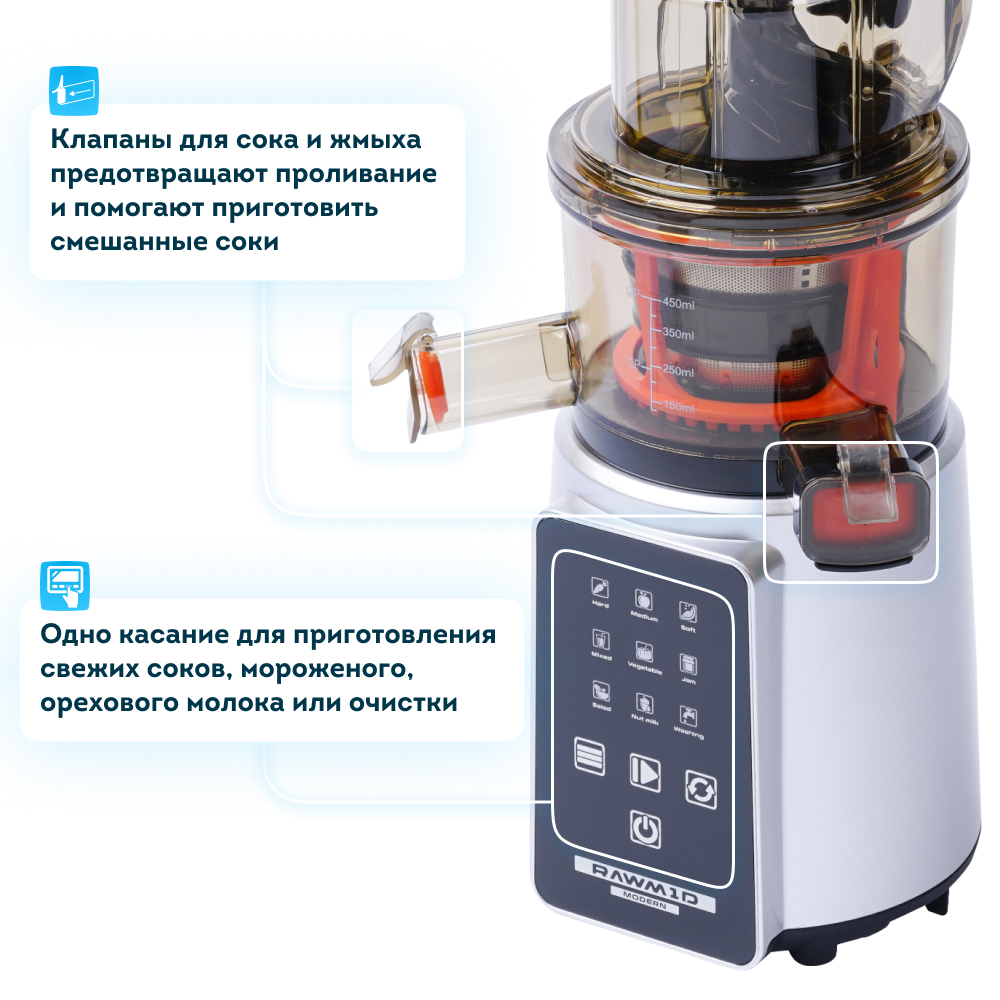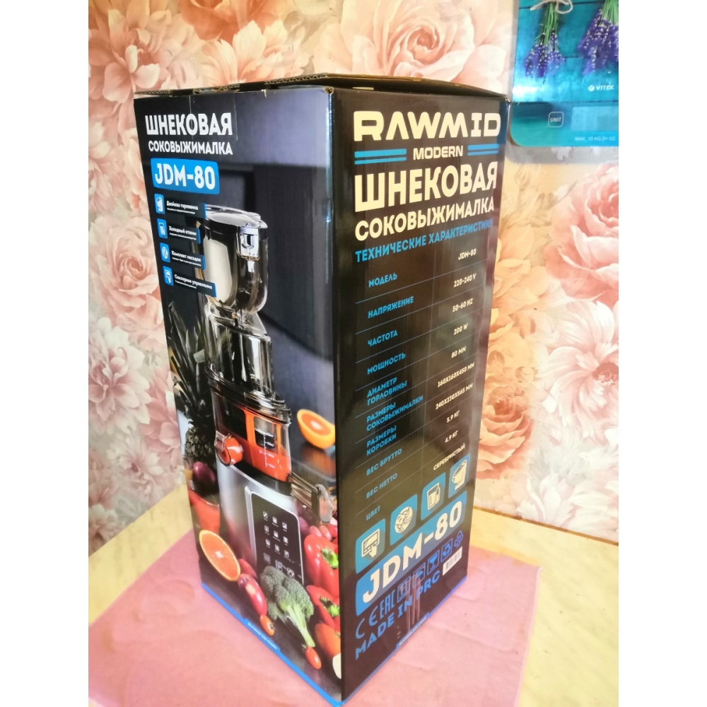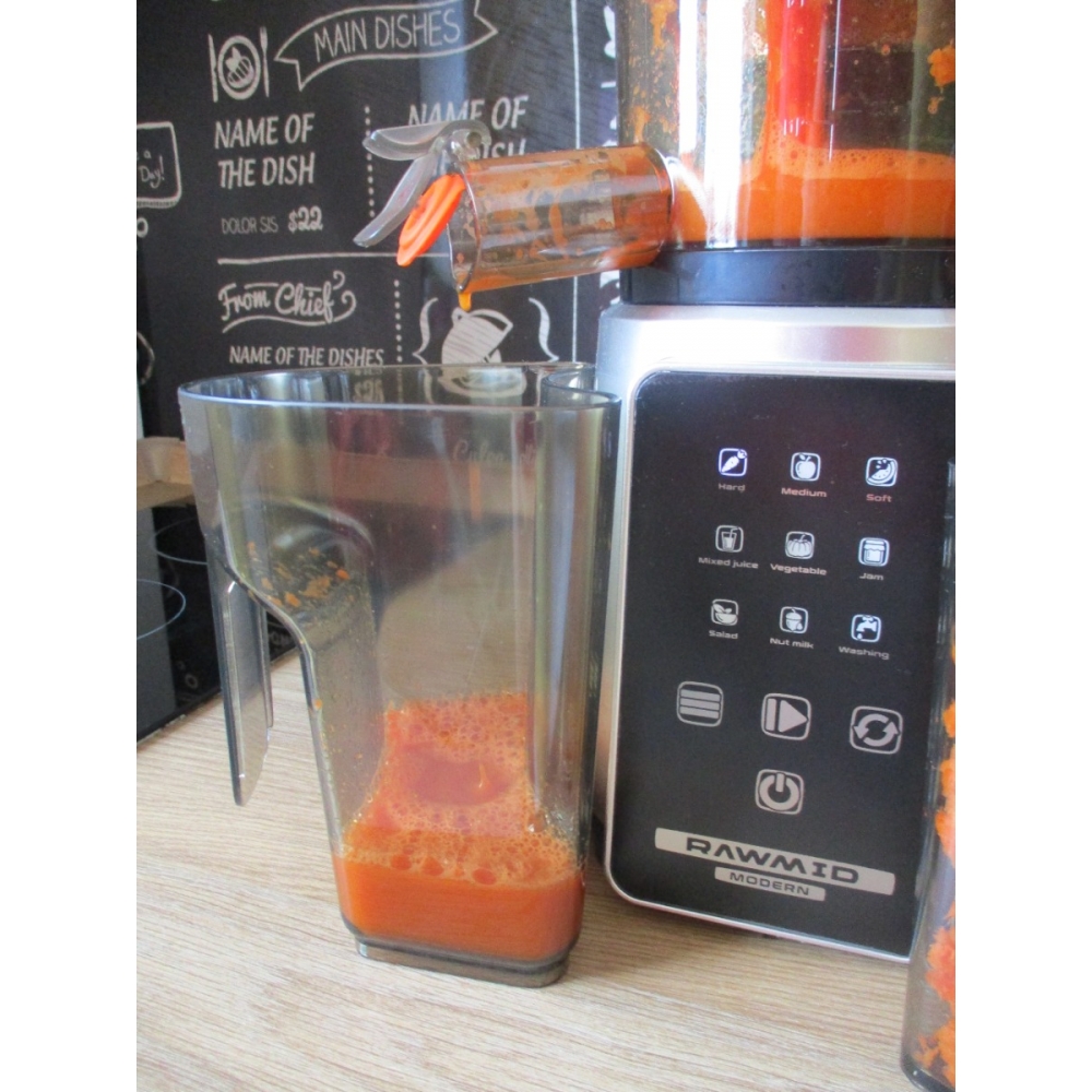 Соковыжималка холодного отжима RAWMID Dream Modern JDM-80 впечатляет по всем параметрам: предельно универсальная, эффективная, качественная. Прибор с сенсорной панелью выглядит безукоризненно, большой плюс можно поставить за малые габариты. Это идеальная соковыжималка для твердых овощей и фруктов, цельных плодов размером до 80 мм, зелени, травы, ягод. Другими словами, идеальный спутник для тех, кто выбирает здоровое питание.