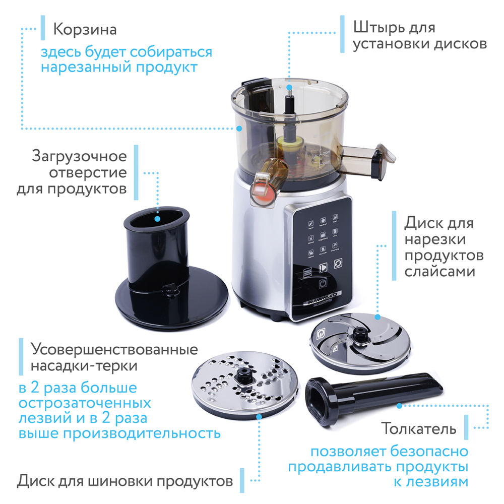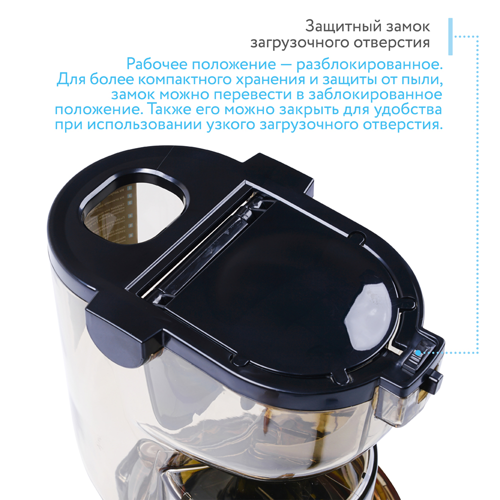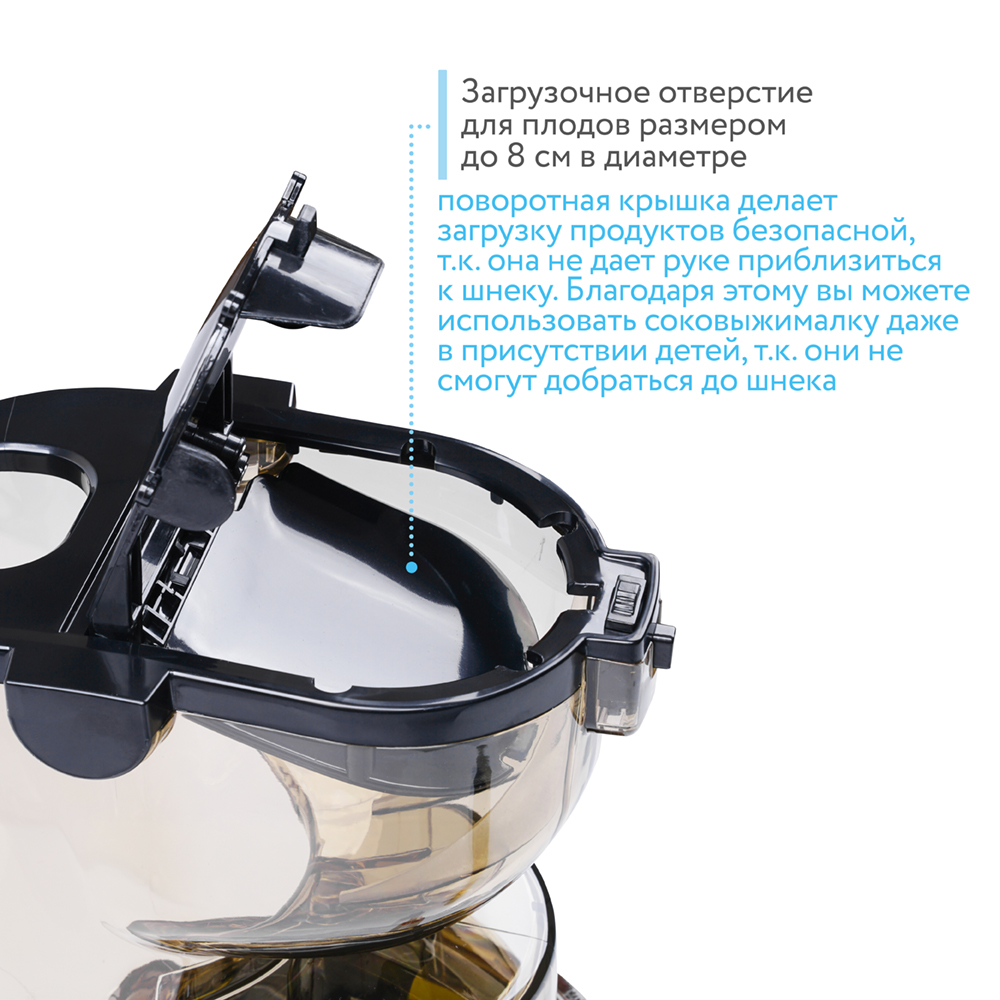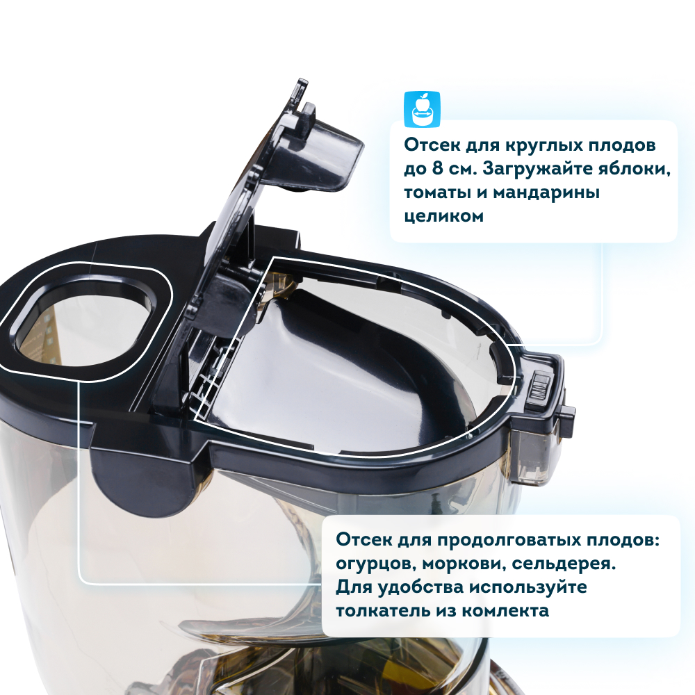 Два загрузочных отверстия позволяют оптимизировать загрузку разных продуктов. Продолговатые плоды (морковь, огурцы, стебли сельдерея) помещаются в узкое горлышко и проталкиваются к шнеку при помощи уплотнителя (входит в комплект). Округлые плоды (цельные или кусочками до 8 см) безопасно помещаются в крупное горлышко.