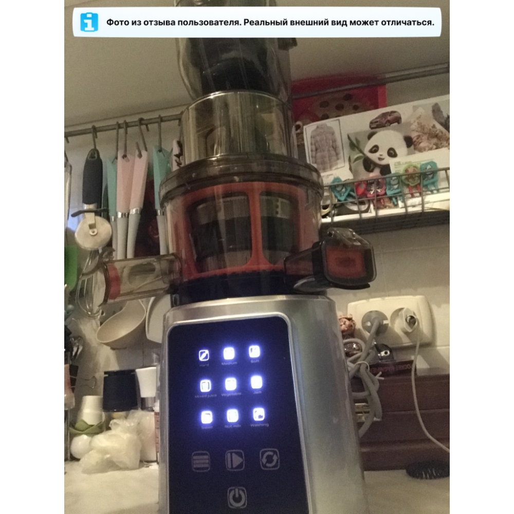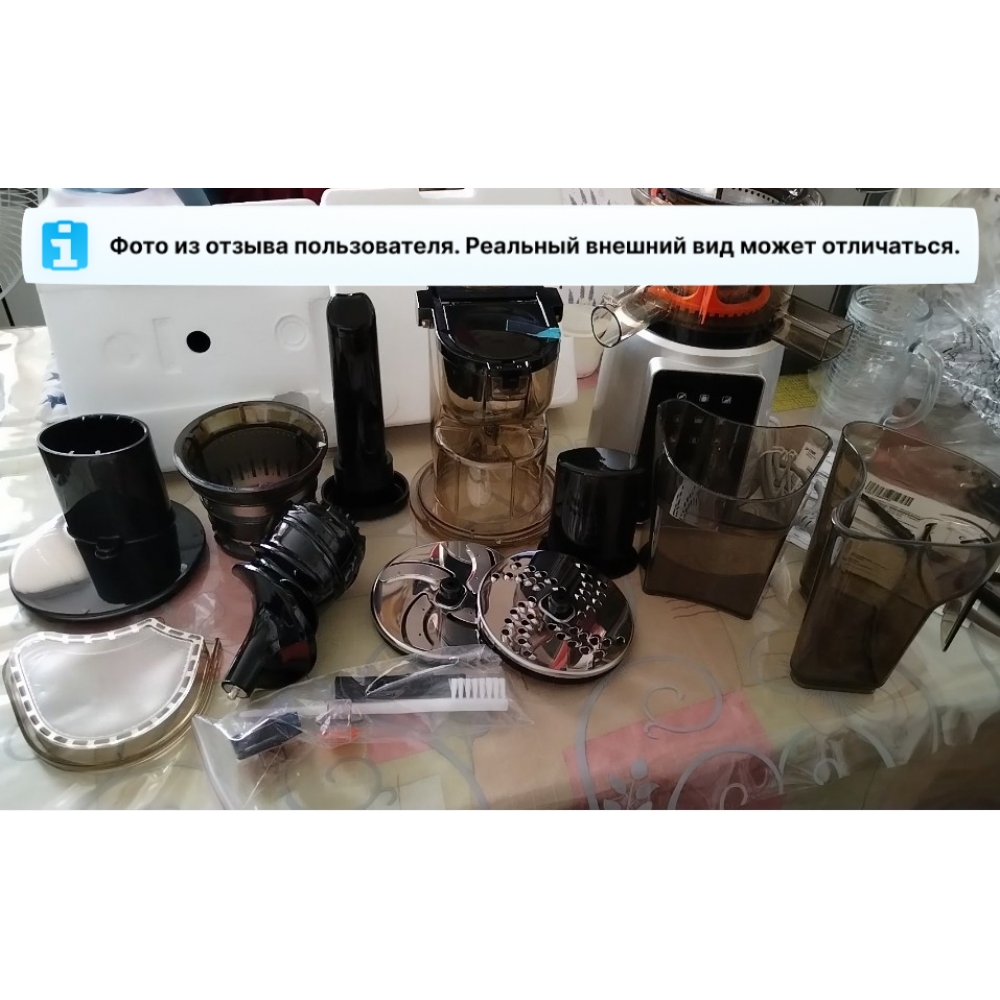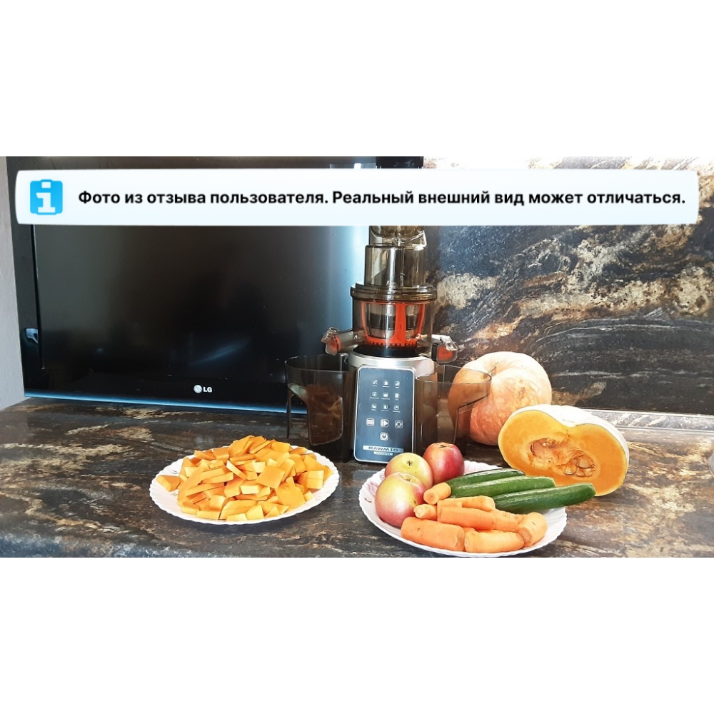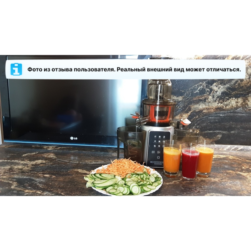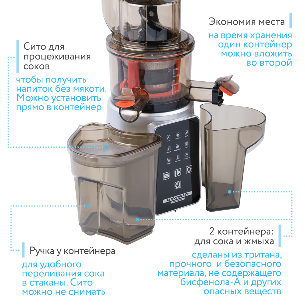 Все детали, контактирующие с продуктами, изготовлены из высококачественных и экологически безопасных материалов. Шнек, корзина и контейнеры сделаны из прочного и экологичного тритана, который не содержат бисфенола А и других опасных соединений.