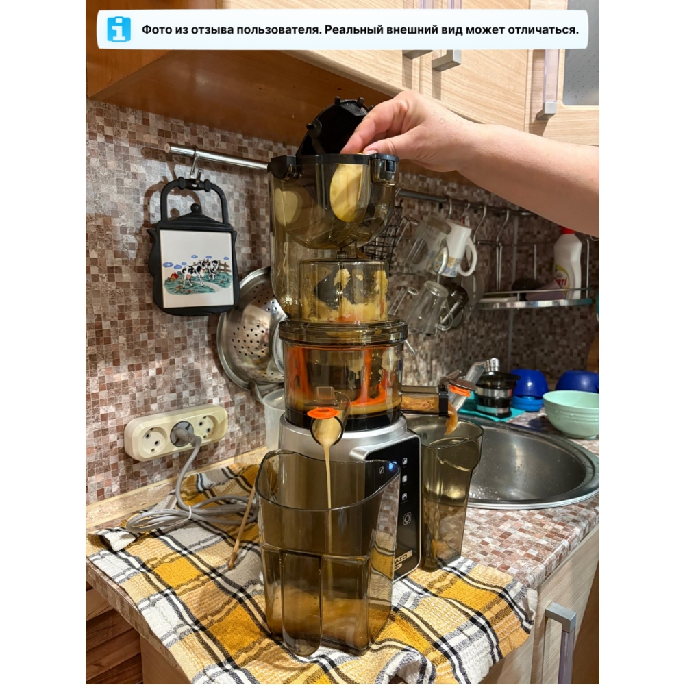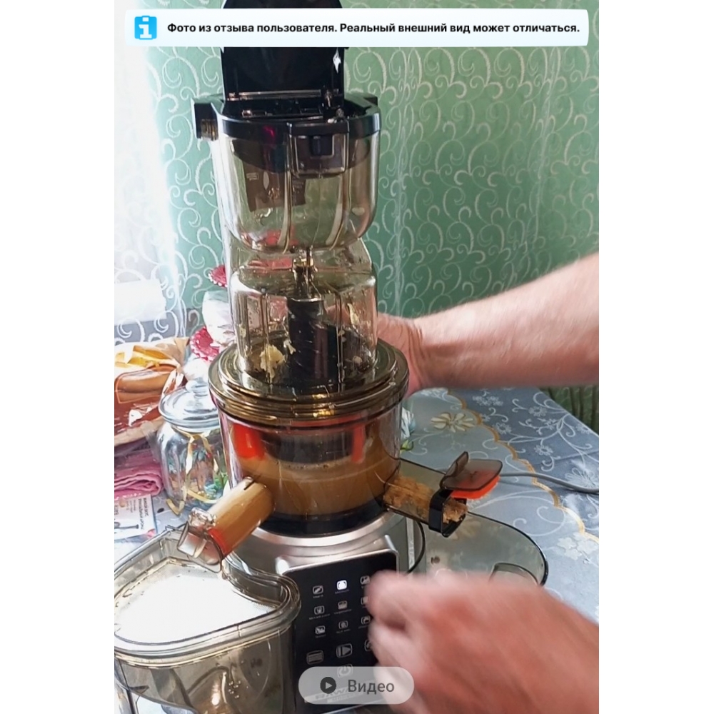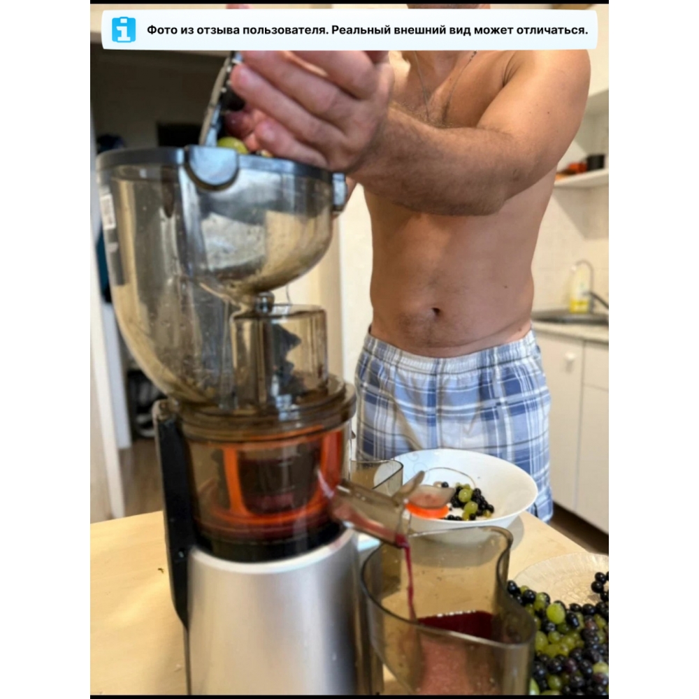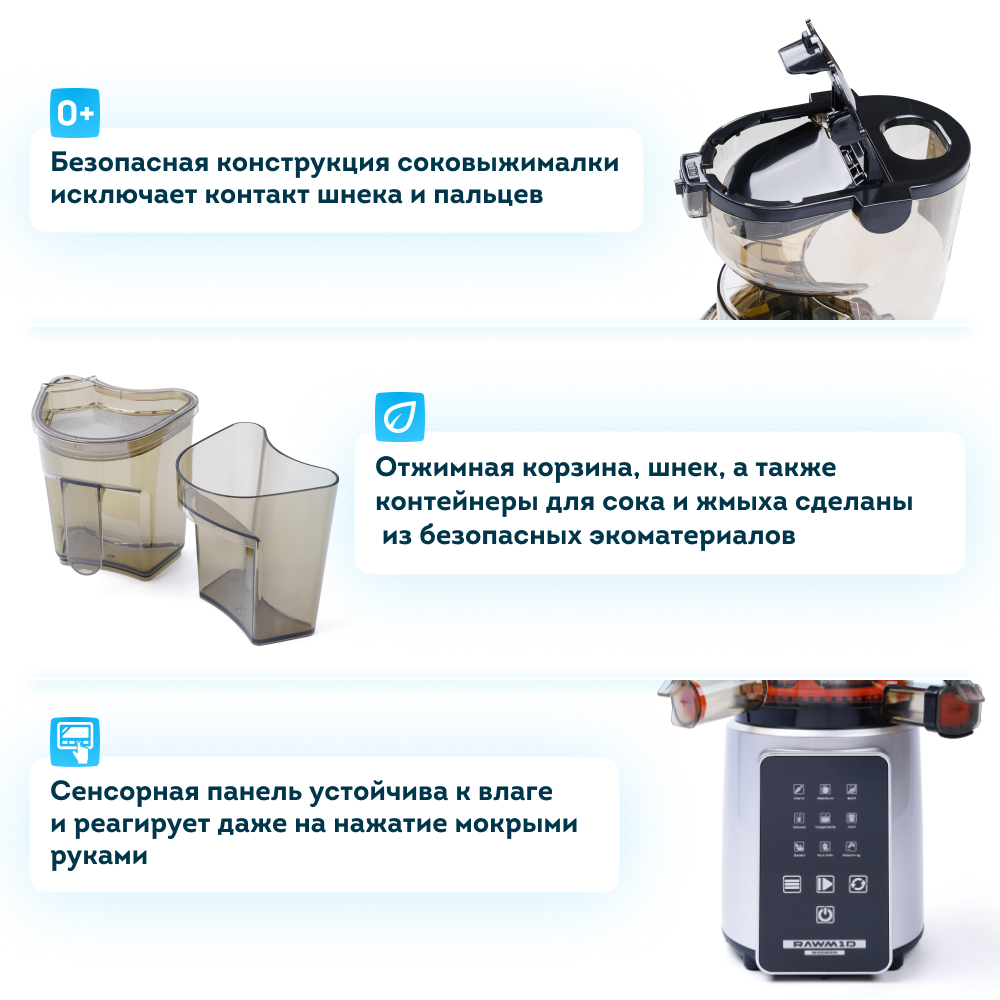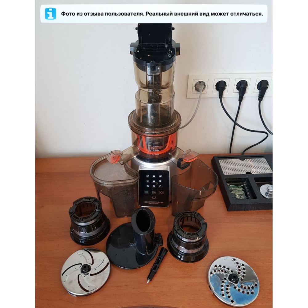 Все детали, контактирующие с продуктами, изготовлены из высококачественных и экологически безопасных материалов. Шнек, корзина и контейнеры сделаны из прочного и экологичного тритана, который не содержат бисфенола А и других опасных соединений.