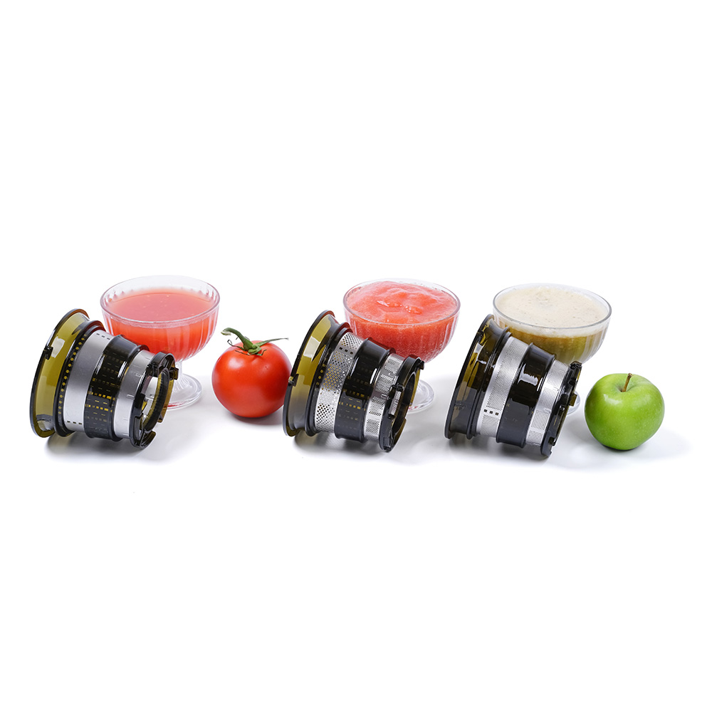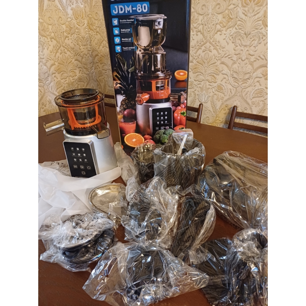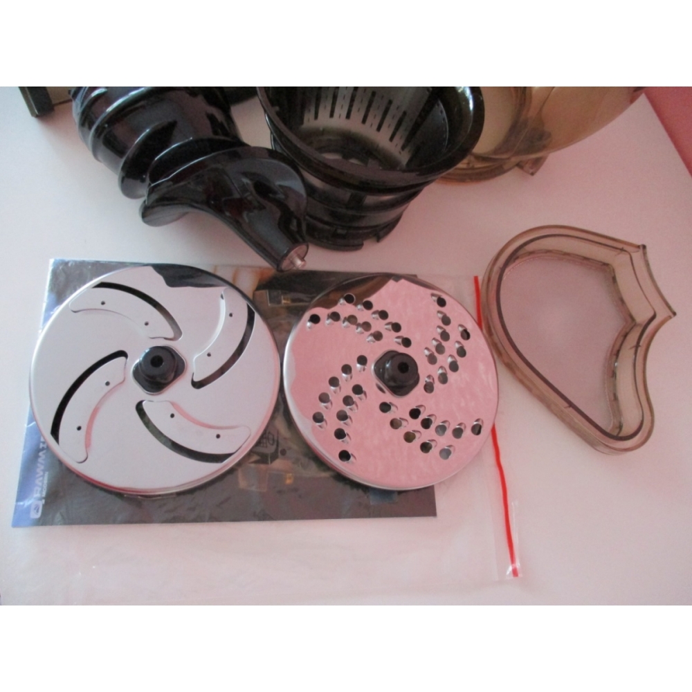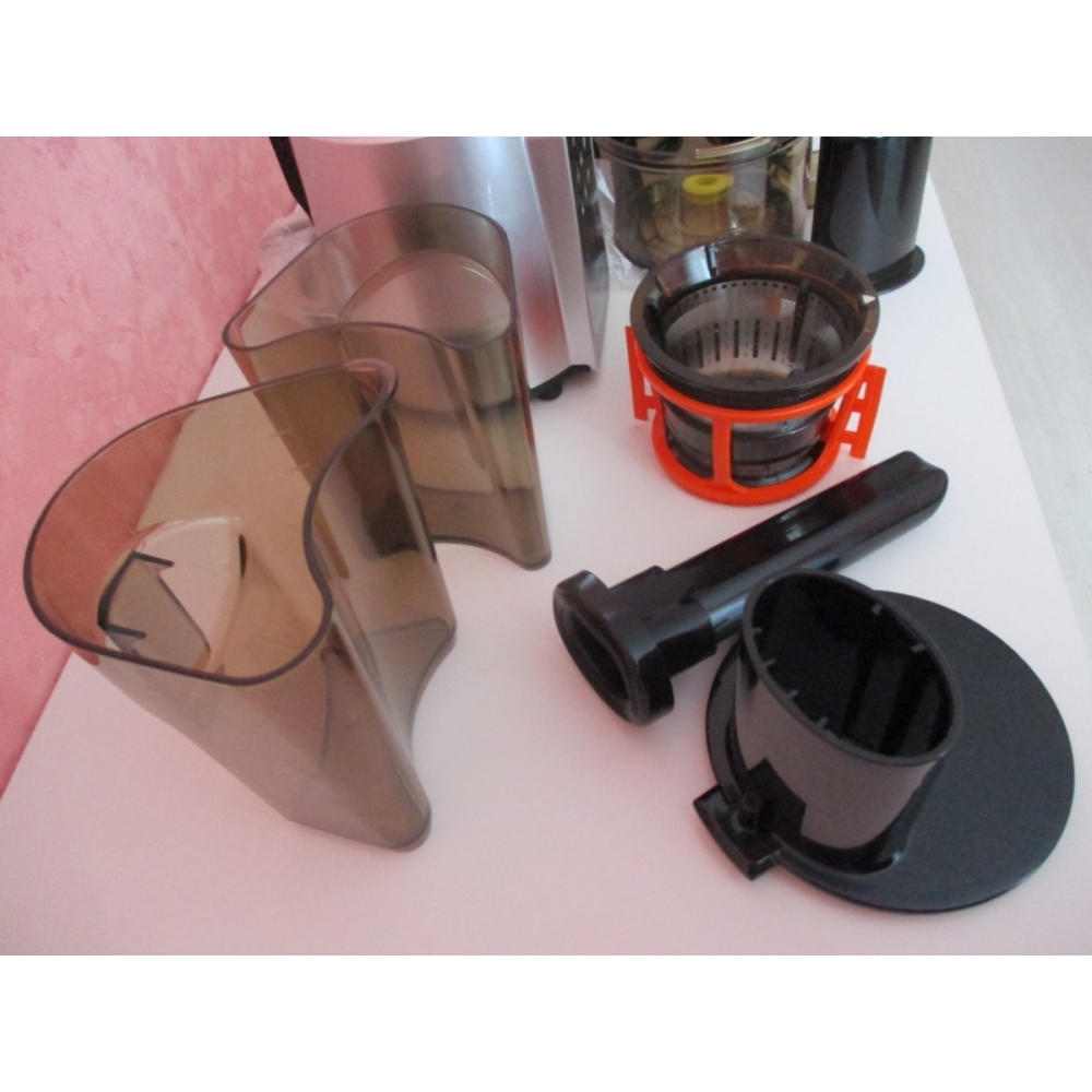 В комплекте имеется два сита – с мелкими отверстиями и без них – для получения чистого сока и приготовления сорбета соответственно. Используйте JDM-80 с любимыми продуктами, получая максимум сока из ягод, овощей и фруктов! Для шинковки в базовой комплектации имеется насадка-тёрка, для нарезки продуктов – насадка-слайсер. Опционально доступна насадка для более эффективного отжима соков из мягких фруктов, а так же для получения смузи.