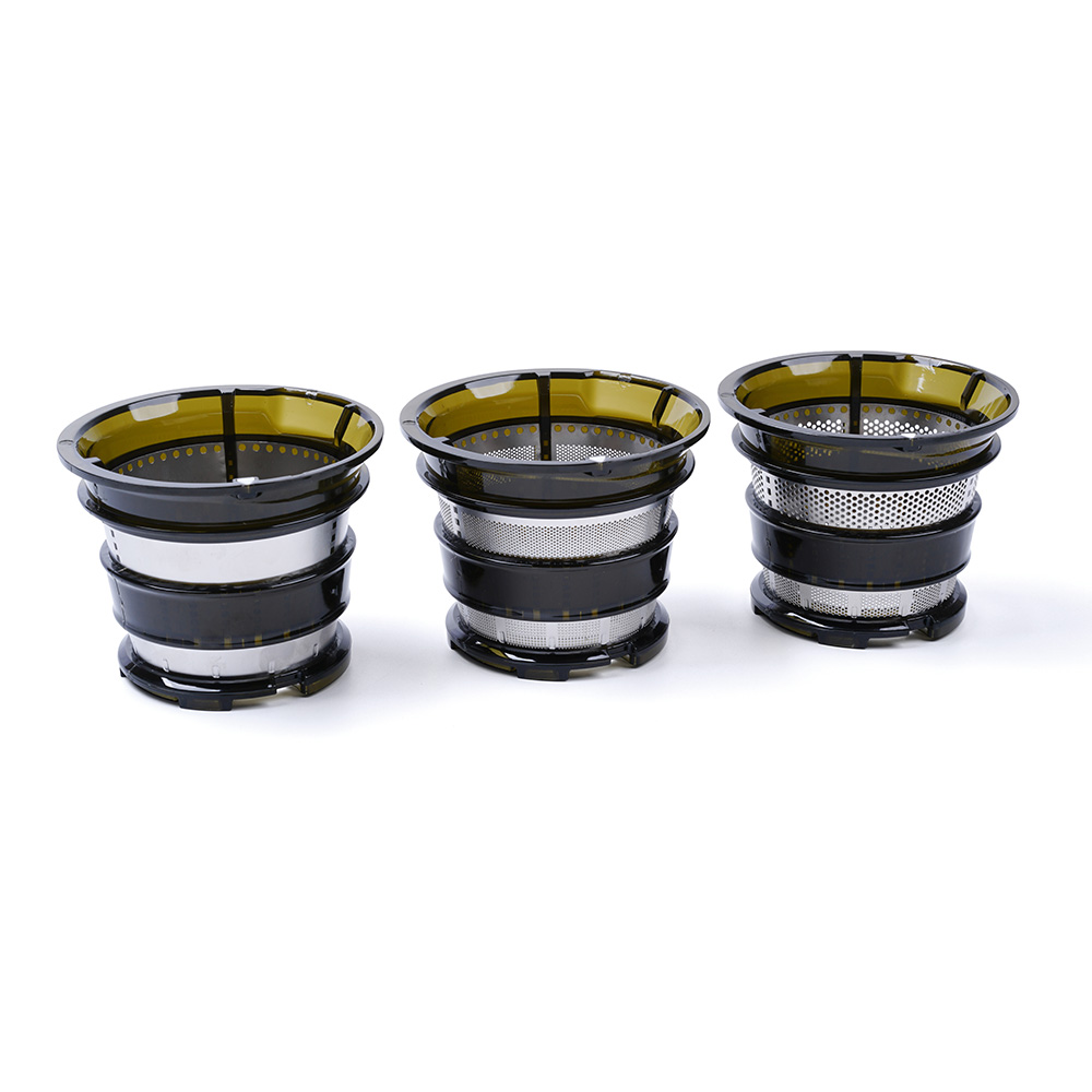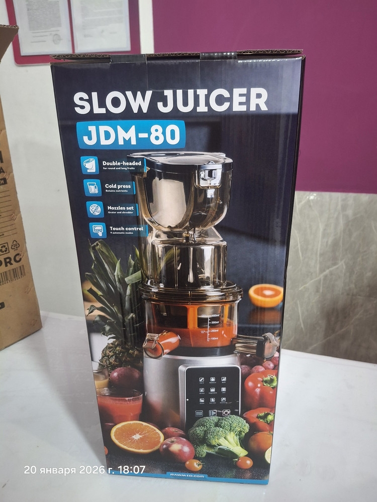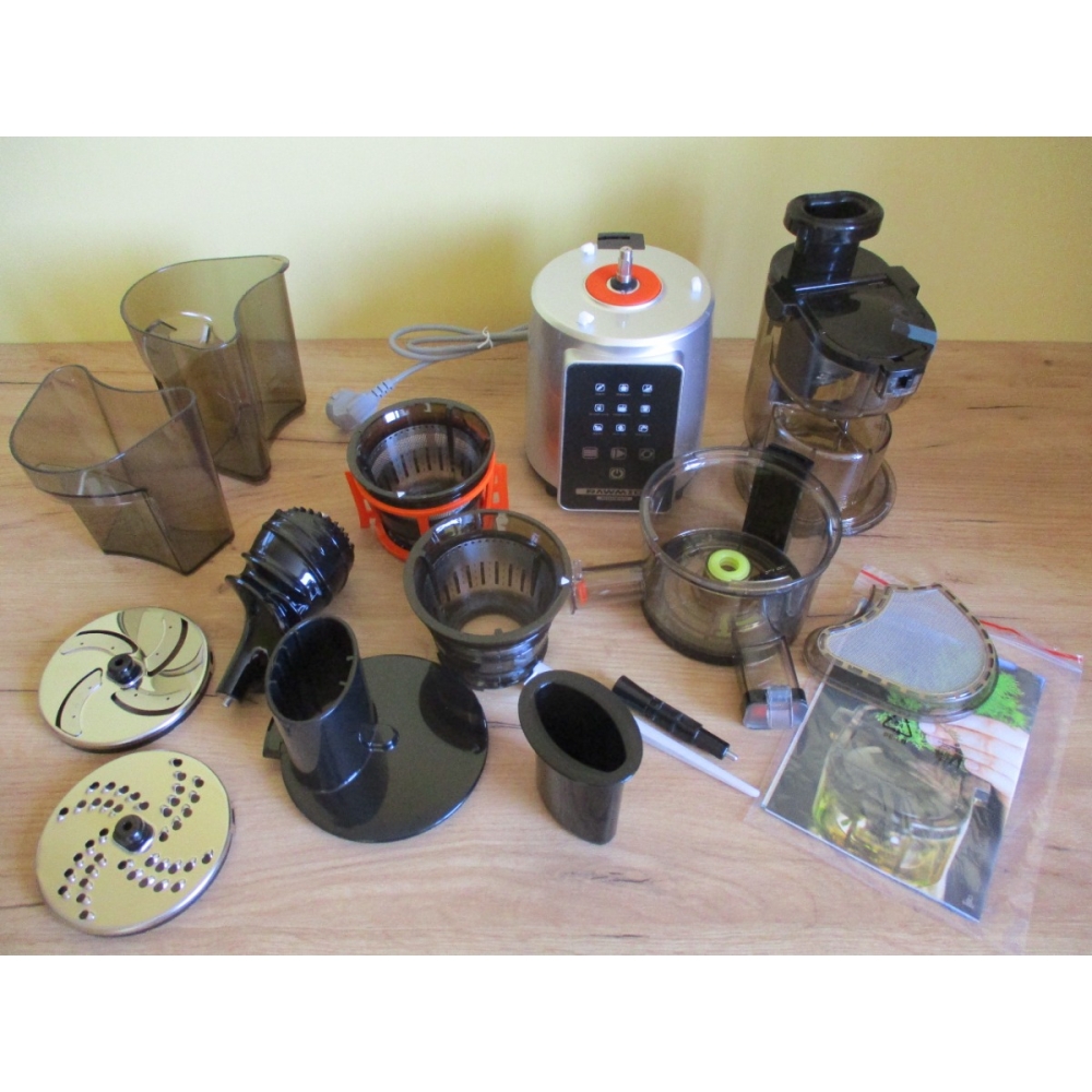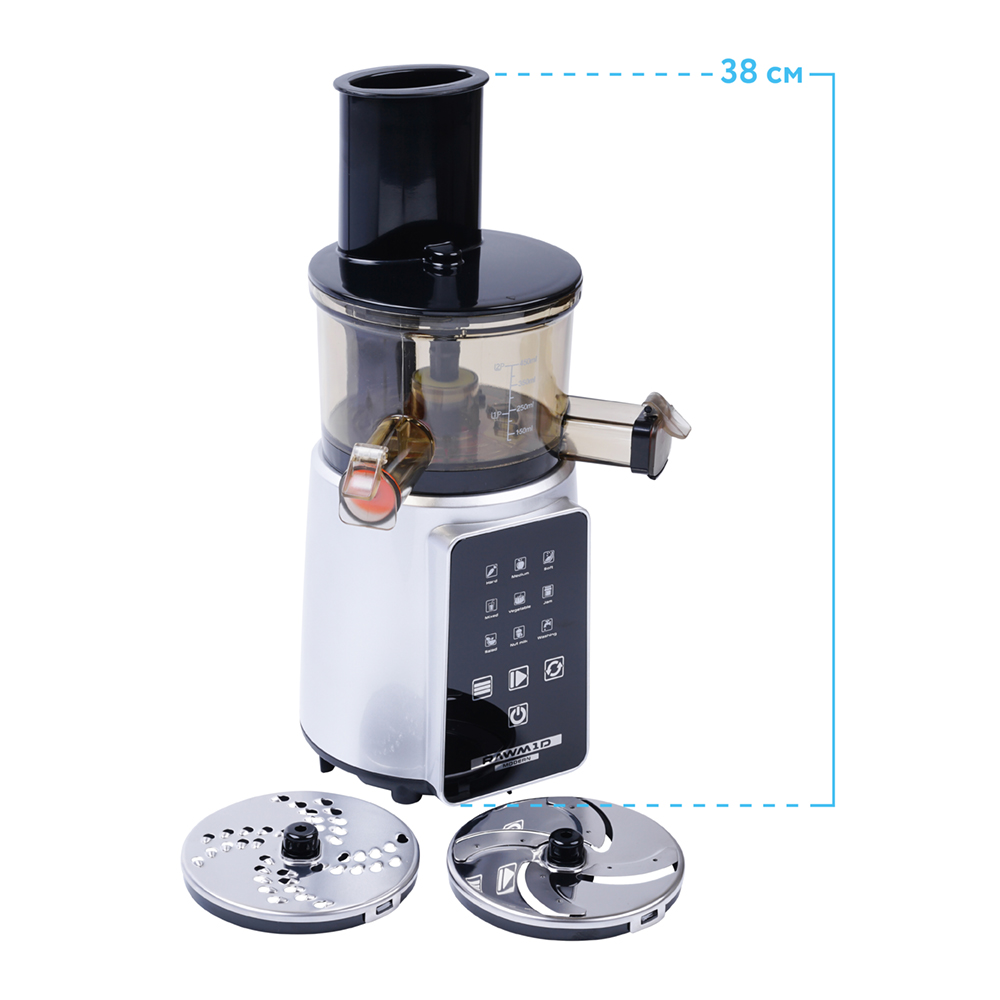 В комплекте имеется два сита – с мелкими отверстиями и без них – для получения чистого сока и приготовления сорбета соответственно. Используйте JDM-80 с любимыми продуктами, получая максимум сока из ягод, овощей и фруктов! Для шинковки в базовой комплектации имеется насадка-тёрка, для нарезки продуктов – насадка-слайсер. Опционально доступна насадка для более эффективного отжима соков из мягких фруктов, а так же для получения смузи.