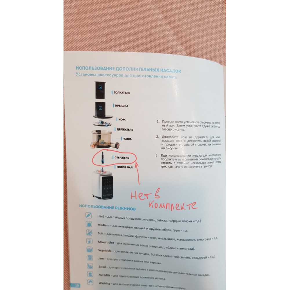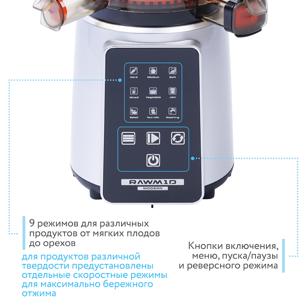 На панели управления предусмотрено 9 режимов для различных задач, в зависимости от типа продуктов: Hard (твёрдые), Medium (средние), Soft (мягкие), Mixed (для смешанных соков), Vegetables (овощи), Jam (для приготовления джемов), Salad (для использования насадок-тёрок), Nut milk (для приготовления орехового молока), Washing (очистка после использования).