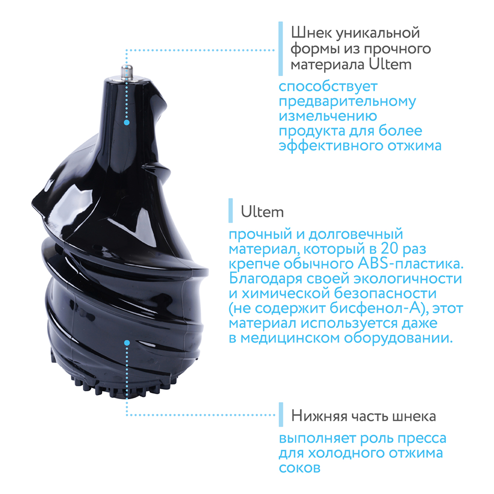 Шнек соковыжималки сделан из сплава, который превышает прочность обычного пластика в 9 раз. Материал используется в авиастроительной промышленности, а также хирургии – благодаря превосходной стабильности механических и физических свойств. Такими прочными шнеками оснащены все соковыжималки от производителя RAWMID.