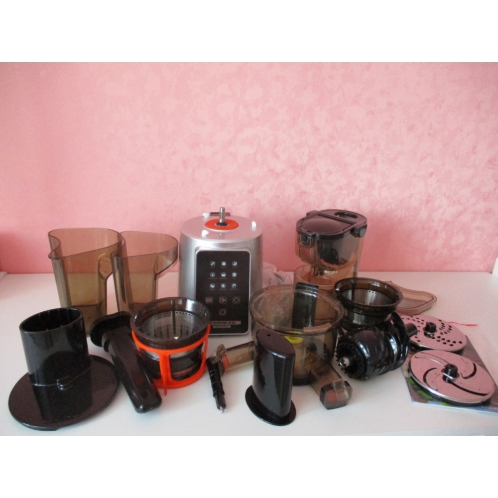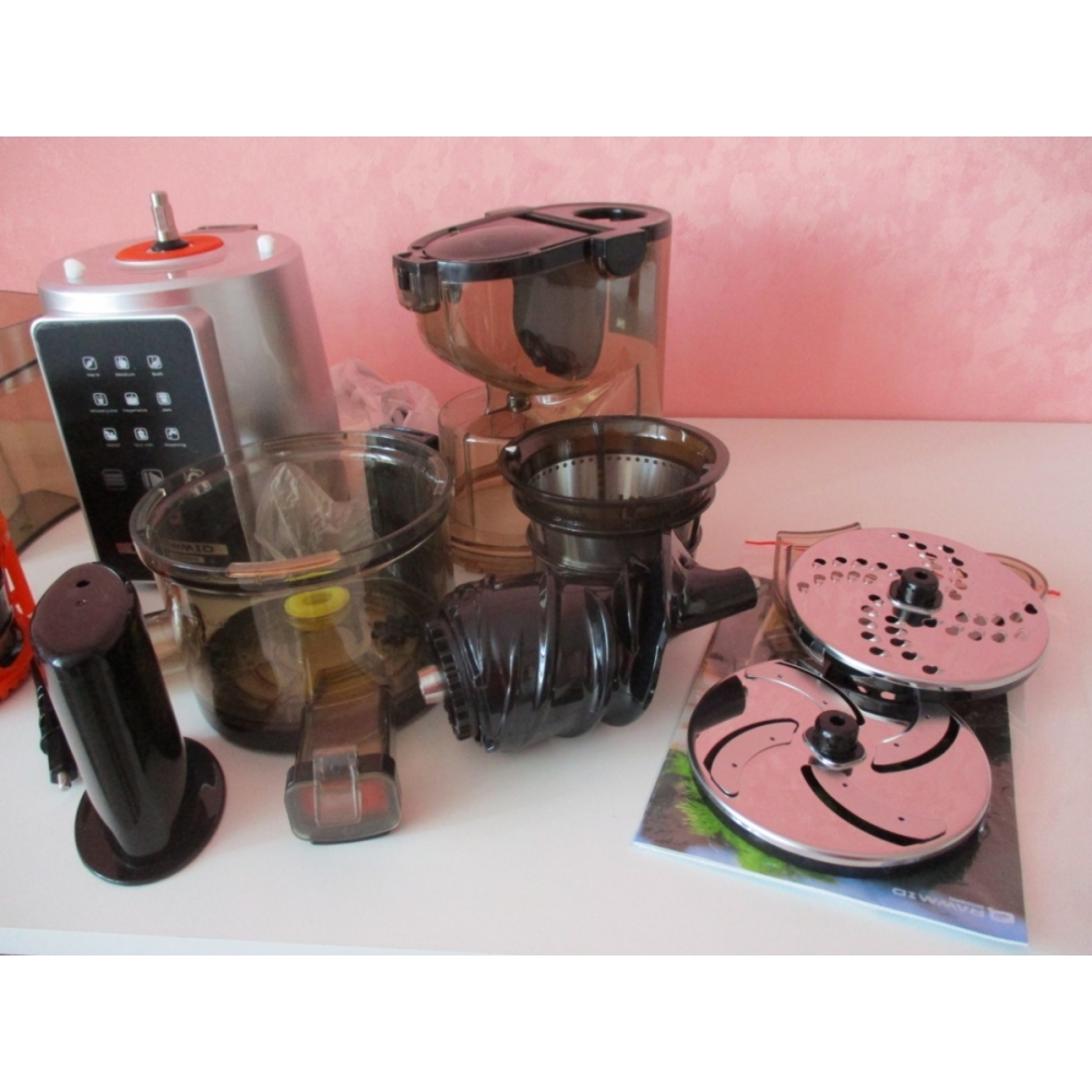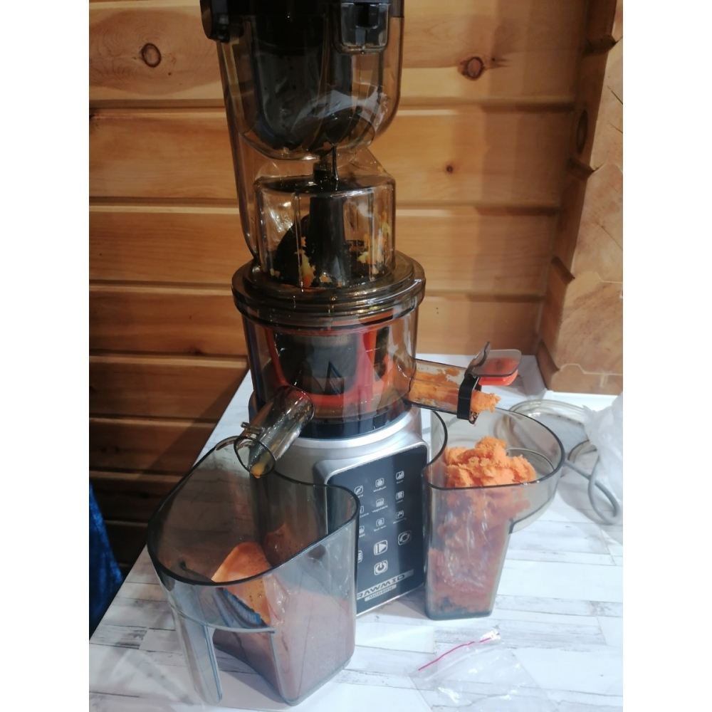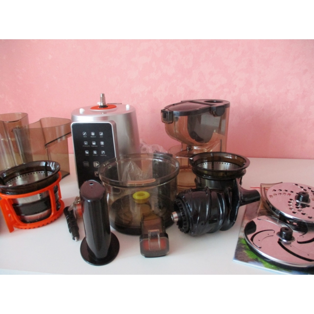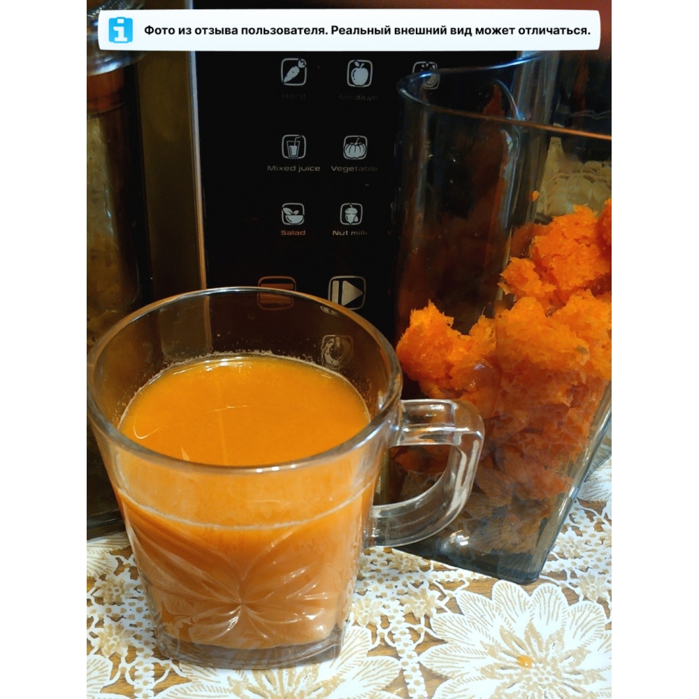 Благодаря мотору мощностью 200 Вт, аппарат может без труда отжать сок из твёрдых продуктов (например, моркови) или приготовить десерт из замороженных ягод и фруктов.