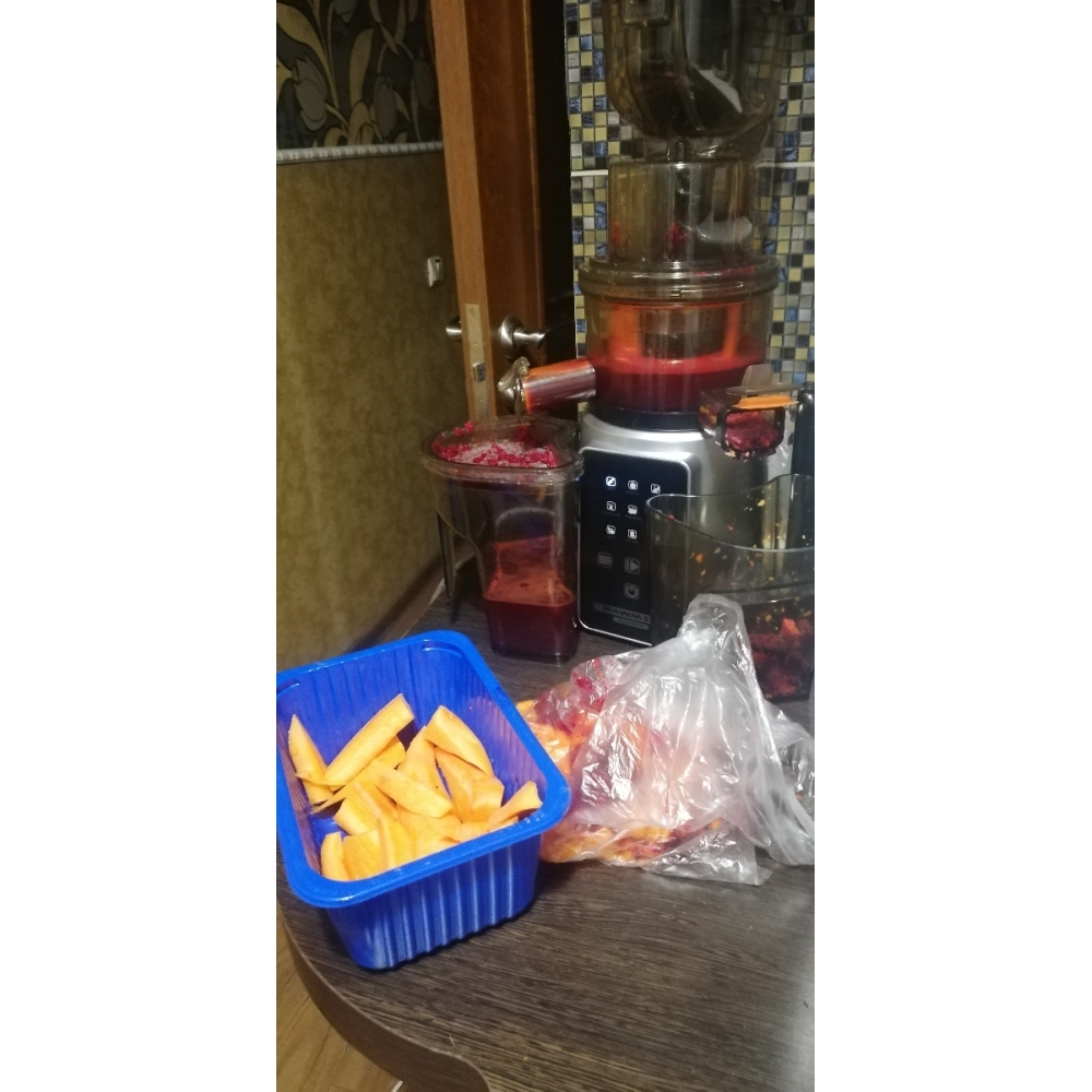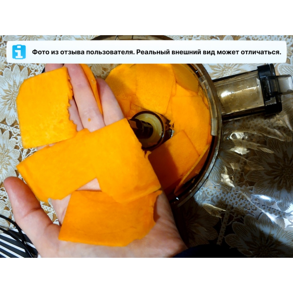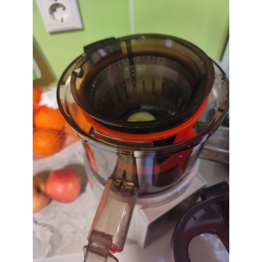 Благодаря широкому загрузочному горлышку диаметром 80 мм подготовка продуктов к отжиму стала проще. Округлые плоды, вроде яблок, томатов, груш и апельсинов теперь можно погружать целиком, без нарезки на более мелкие кусочки. Для лучшего результата следует вносить порции продукта поочередно – каждую новую порцию только после полной обработки предыдущей. Твердые овощи (свеклу) необходимо нарезать на кусочки, а вот для моркови предусмотрено специальное отверстие.
