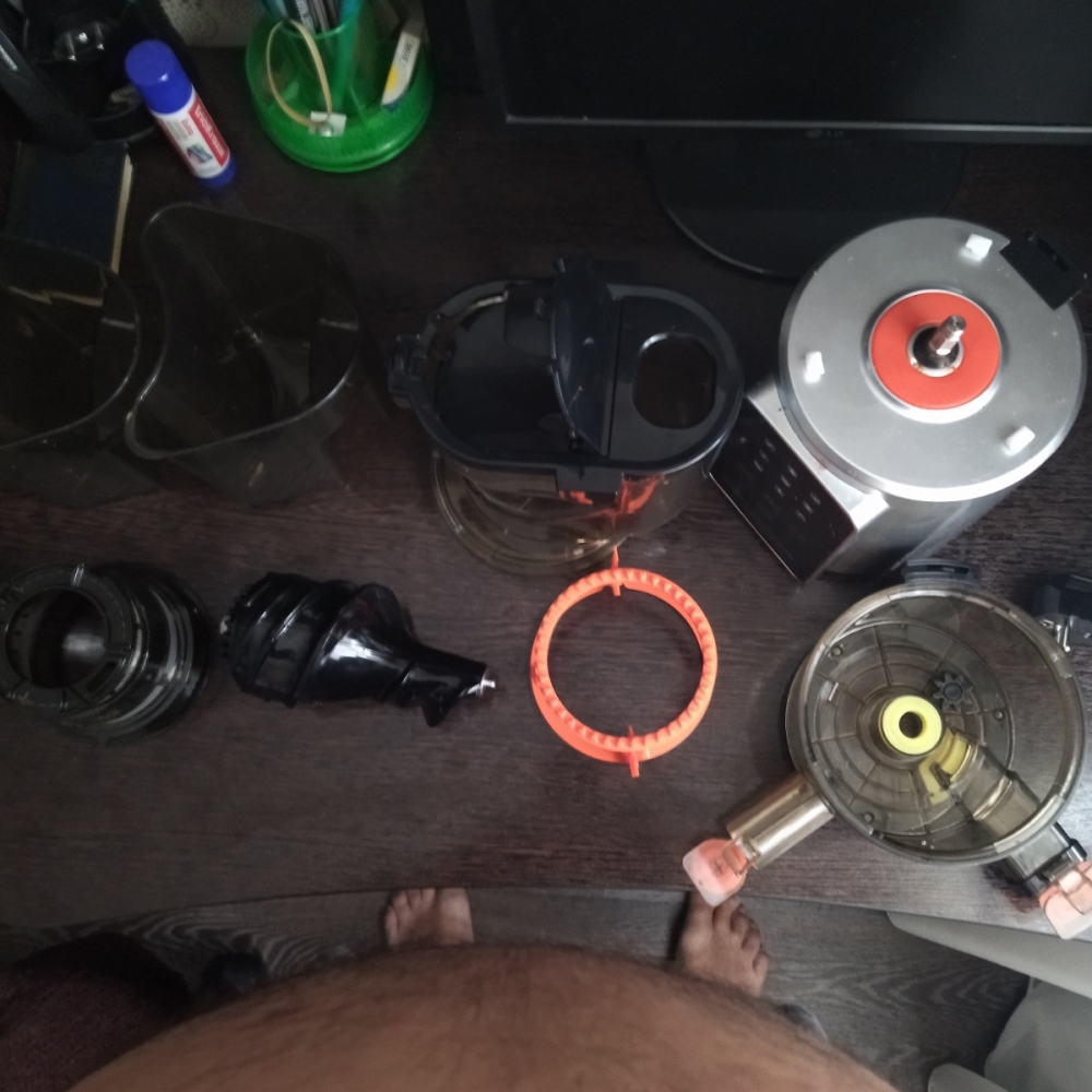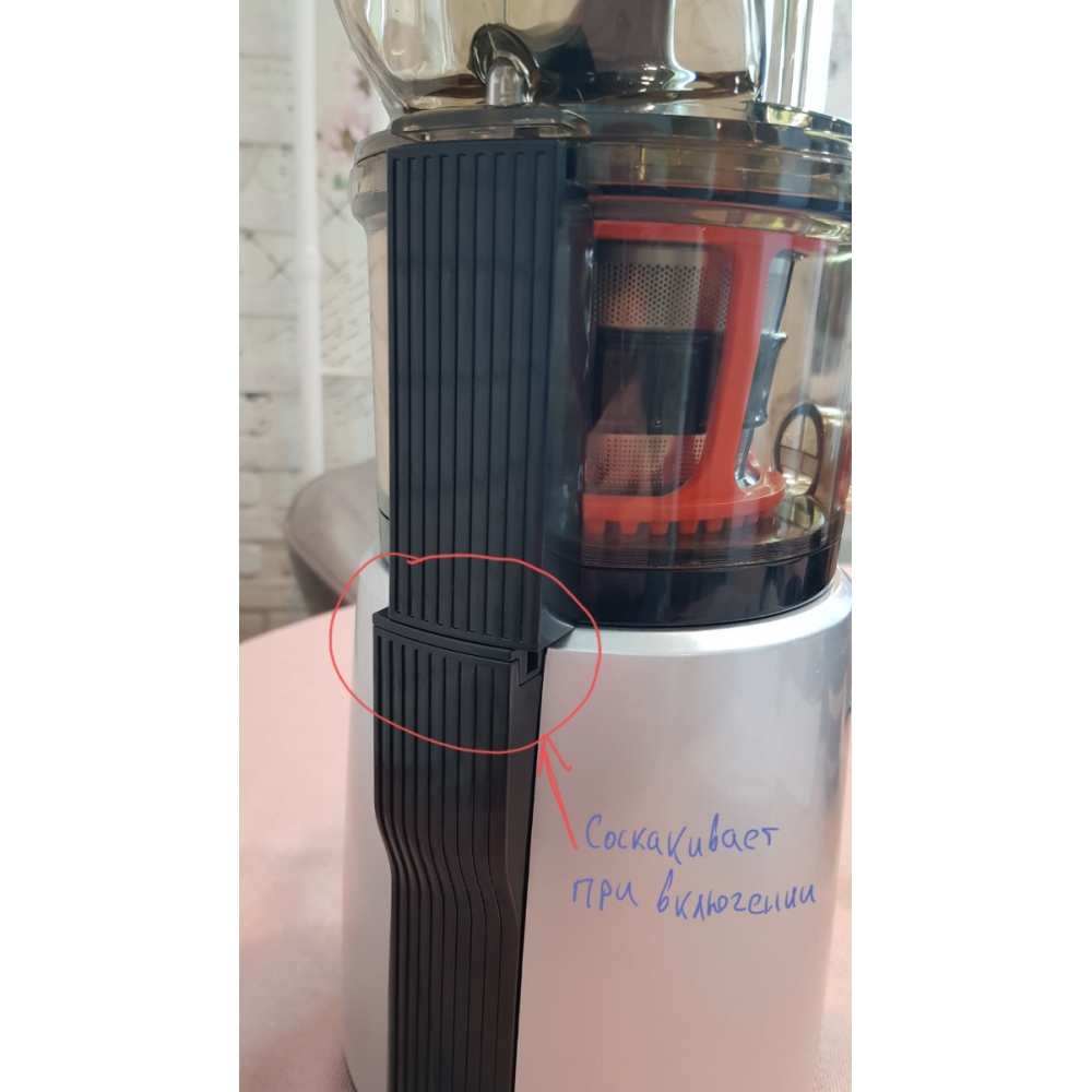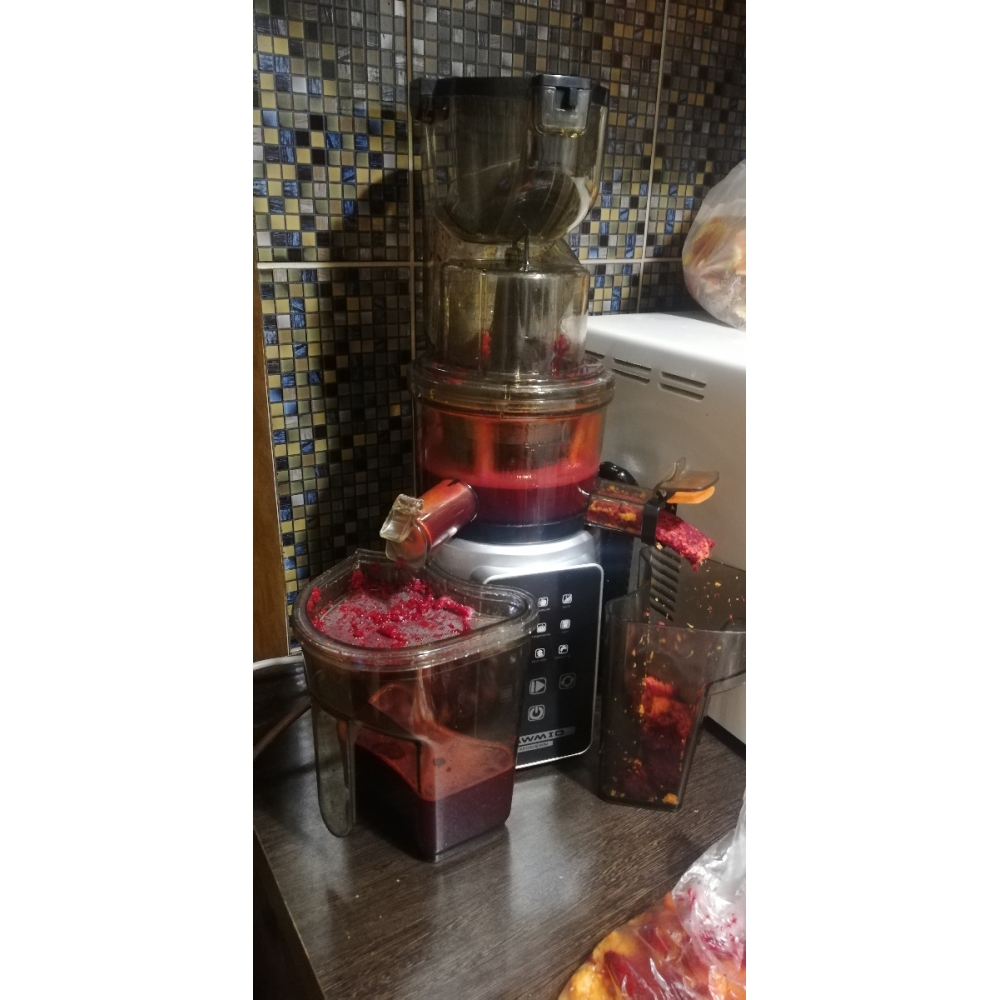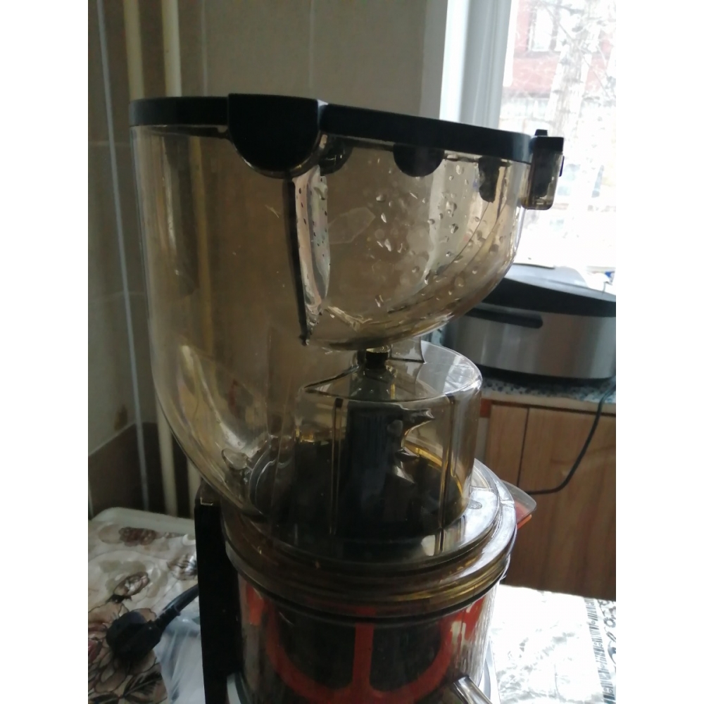 После использования прибора рекомендуется включить режим очистки (Washing) и залить в горловину 400-500 мл воды. В результате значительная часть остатков соков и мякоти смоется со внутренних частей устройства. Оставшиеся мелкие загрязнения легко смываются с деталей после разборки аппарата под проточной водой.