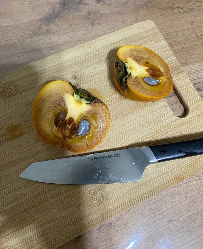 Первым делом попробовал на хурме, настолько легко разрезал, что даже не почувствовалась косточка, которая по итогу разрезалась вдоль без каких либо усилий. На курице показал себя так же превосходно, с таким кончиком ножа удобно подрезать жилки.