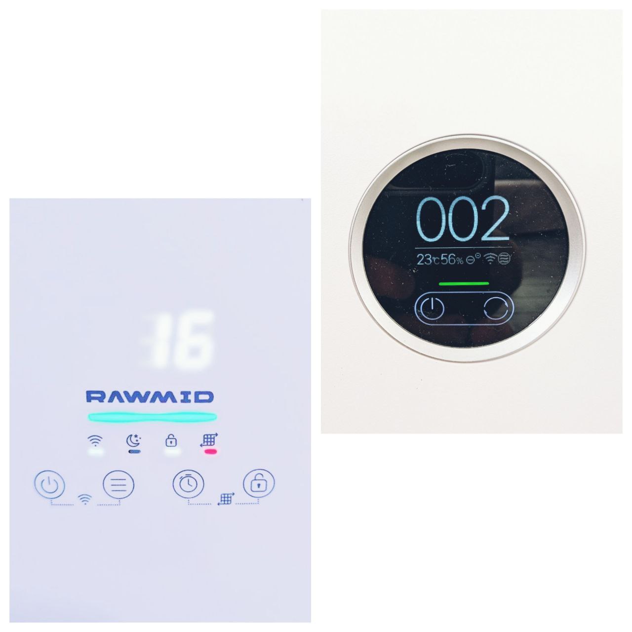 Дисплей у RAWMID спрятан под пластиковой панелью, что создает эффект размытости и приглушенности — на мой взгляд, это выглядит очень симпатично. 😊 Оба дисплея имеют индикацию загрязненности и меняют цвет индикатора по мере ухудшения качества воздуха. Также на экранах отображается информация о подключении к Wi-Fi, текущем режиме и включении ионизатора, а также о необходимости замены фильтра.