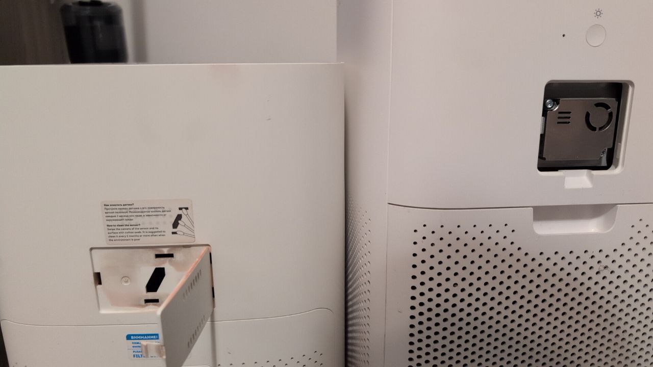 а задней панели обоих очистителей расположены лючки, за которыми находятся датчики пыли. У RAWMID под лючкой находятся только прорези, через которые нужно чистить датчик ватной палочкой, а у Xiaomi располагается сам датчик. Думаю, что наличие датчика в "недосягаемости" — это более правильное решение, так как это снижает риск его повреждения.