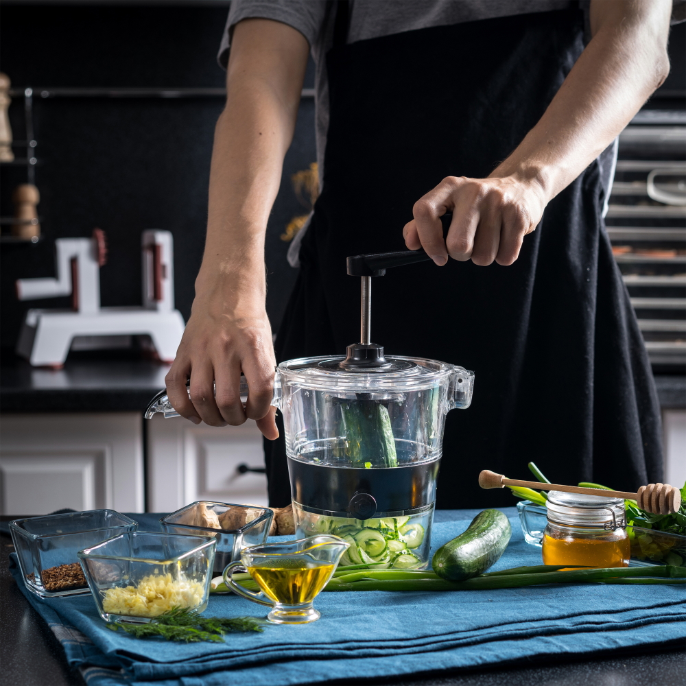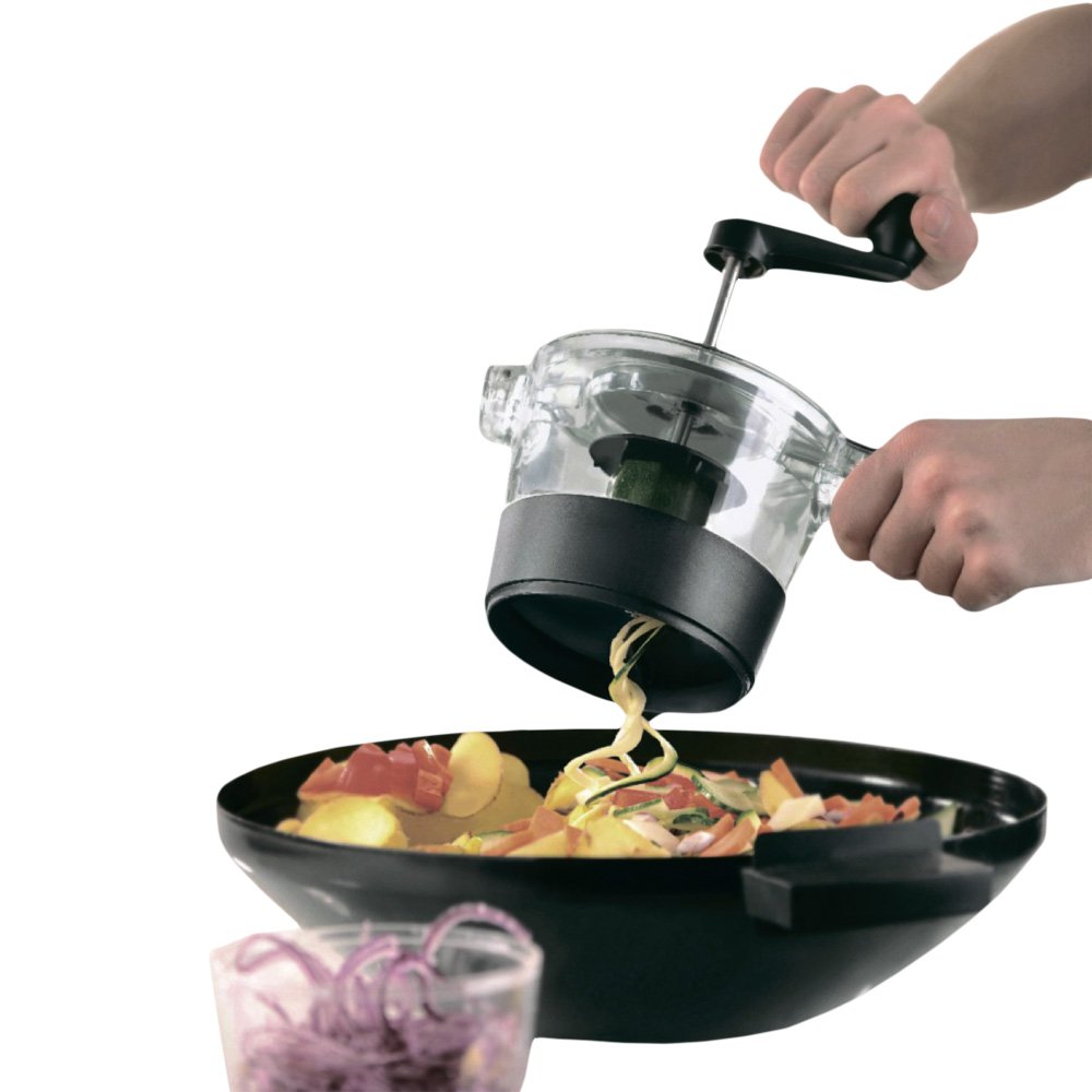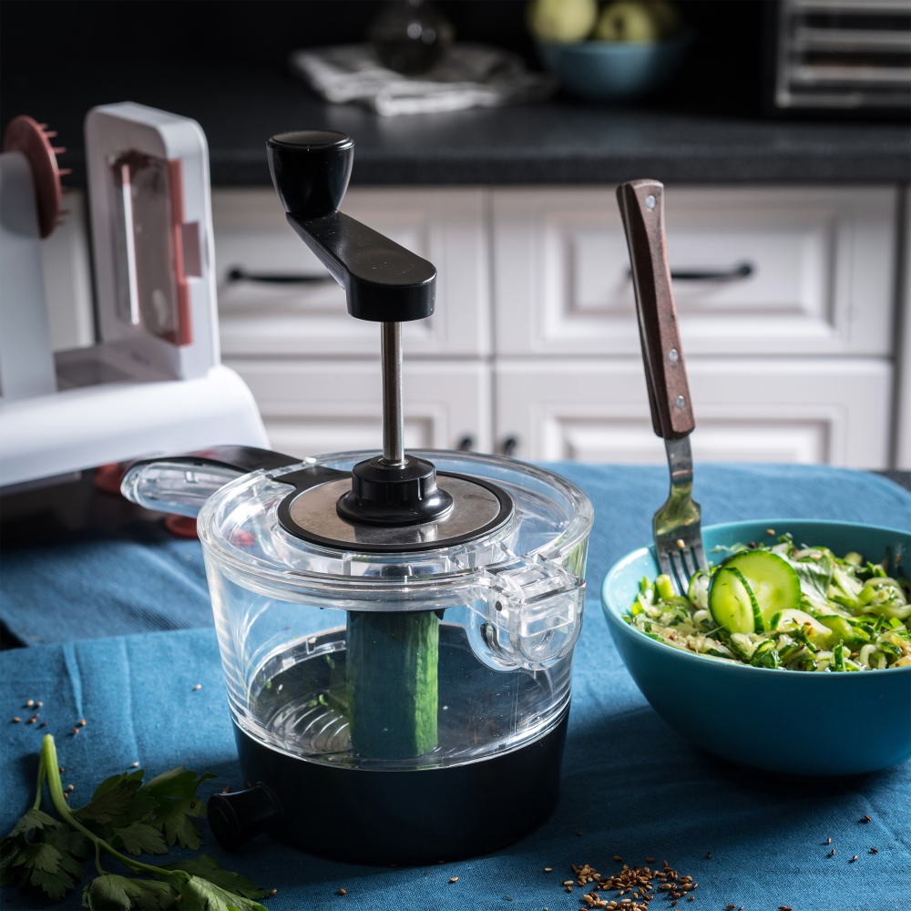 На крышке корпуса устанавливается ручка, которая приводит в движение спиральную тёрку. Устройство полностью механическое, а значит, не нужно тратить электроэнергию и все полезные вещества овощей переходят в блюдо в полном объеме.