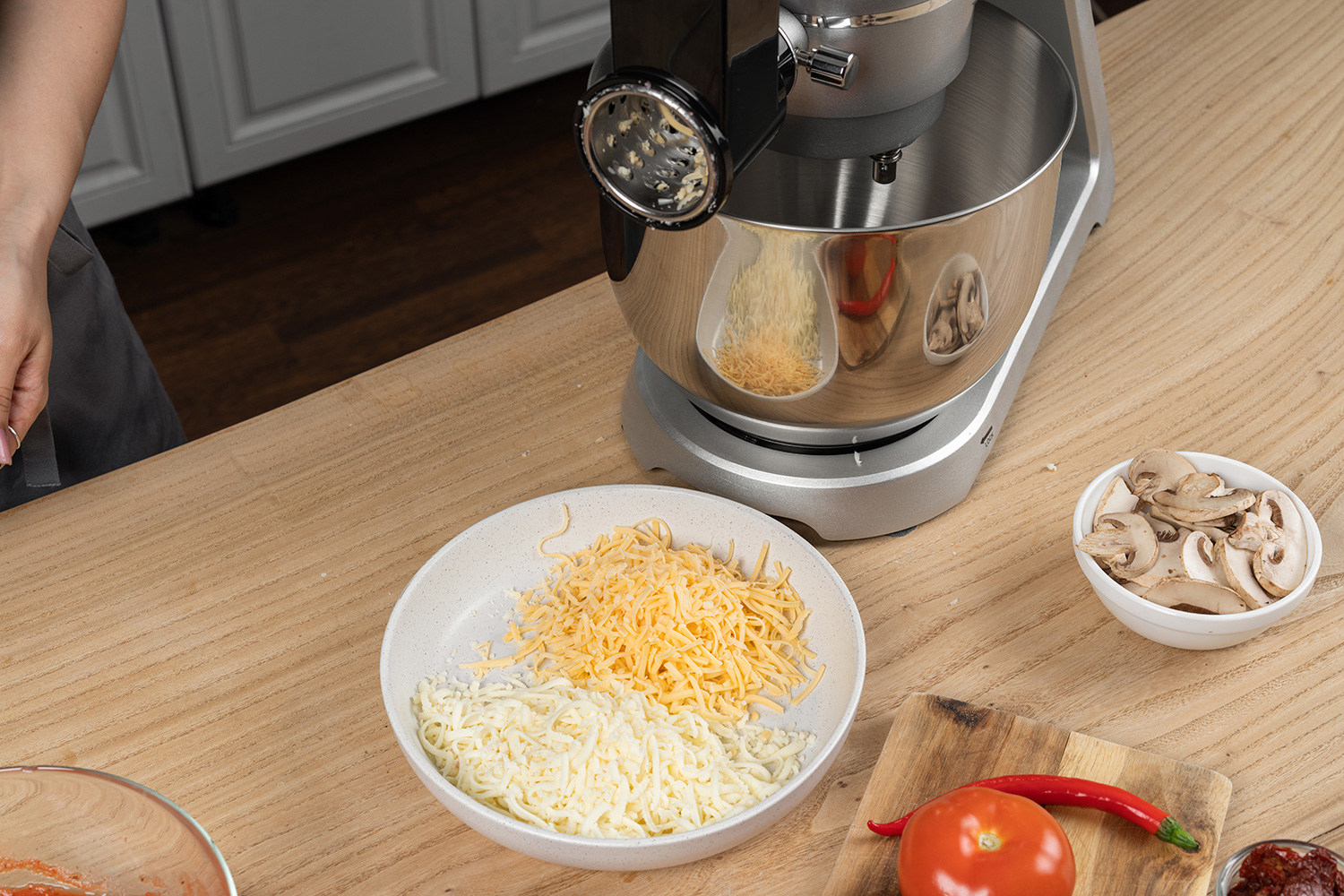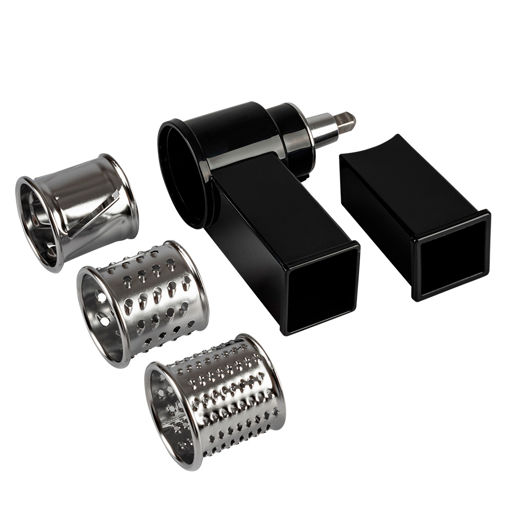 В комплект входит толкатель, обеспечивающий безопасную подачу продуктов к тёрке.