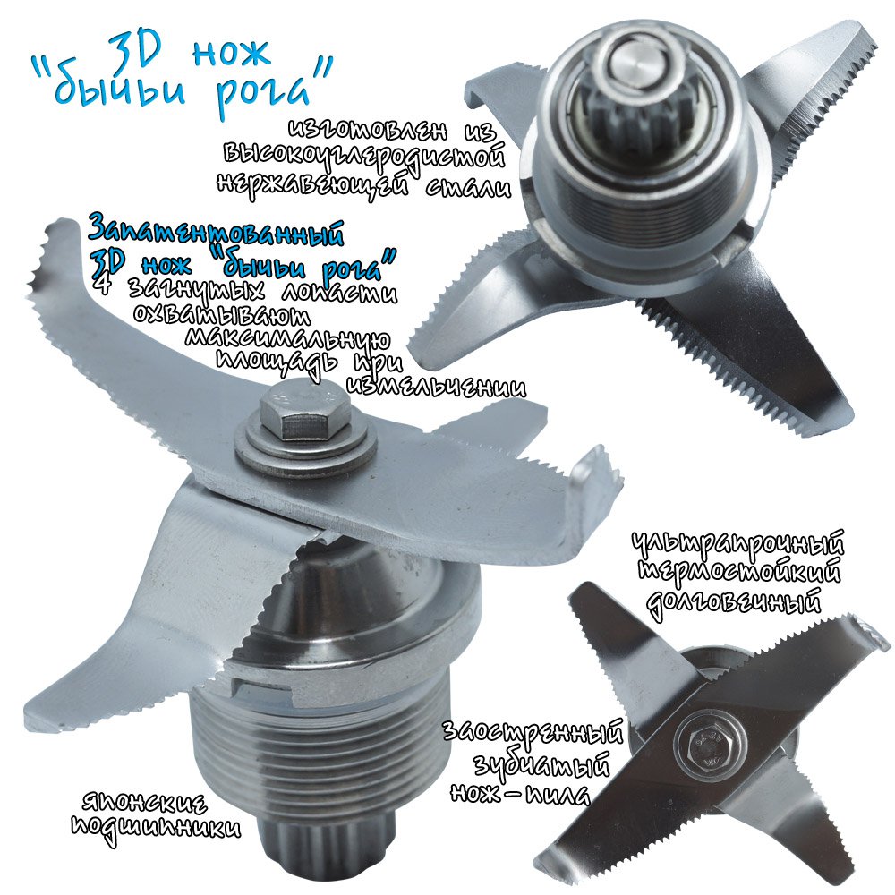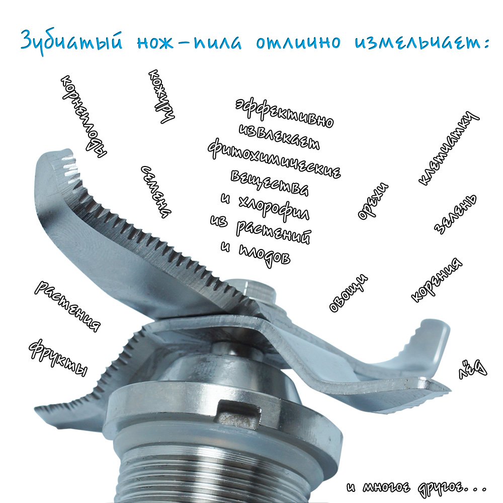 Этот мощный блендер оснащен поистине уникальным ножом с заостренными зубчатыми лезвиями. Шесть лопастей с зубчиками работают бережно, сохраняют клеточную структуру растительных продуктов. А это значит больше фитоэлементов для иммунитета и крепкого здоровья! Простая русифицированная панель имеет регулятор для управления мощностью, кнопки питания и режима «импульс».