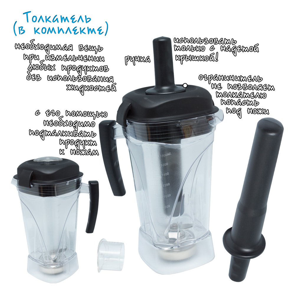 Плотная фиксация резиновой крышки обеспечивает полную герметичность, предотвращает подтеки при работе с любыми объемами напитков. Толкатель, разместившийся в центре, является нужным и удобным инструментом, когда речь заходит о более сухих продуктах. Измельчая орехи, осевшую на стенках массу можно легко и безопасно протолкнуть к ножу.