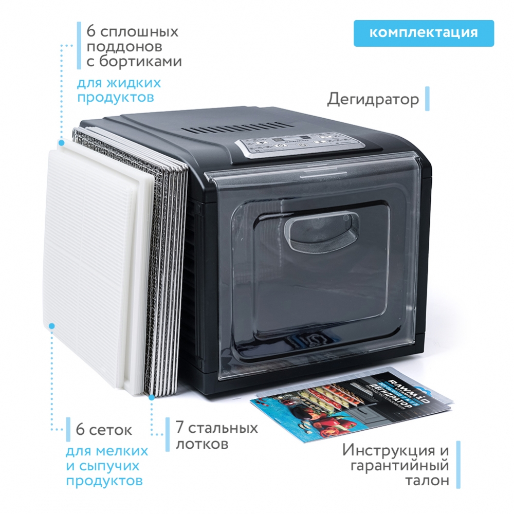 Также в комплект устройства входит инструкция на русском языке и электронная книга с рецептами для дегидратора.