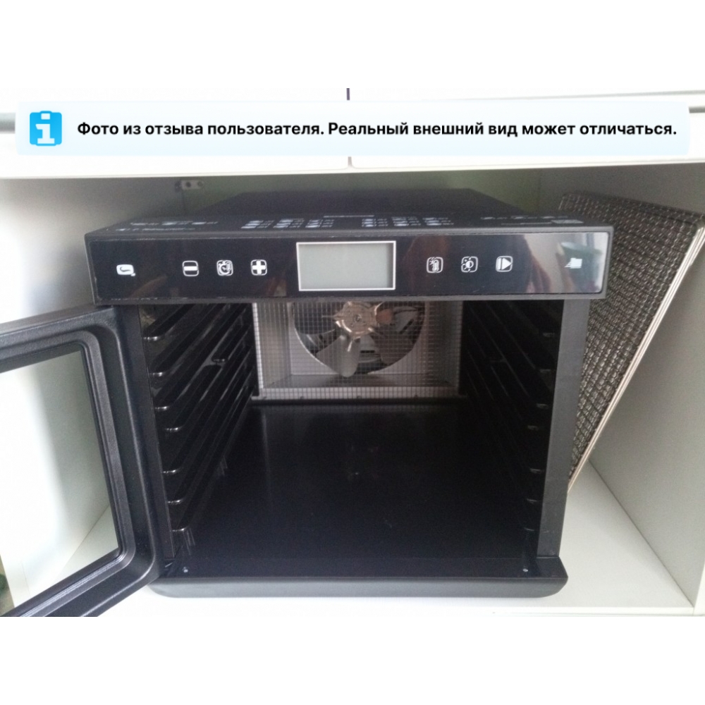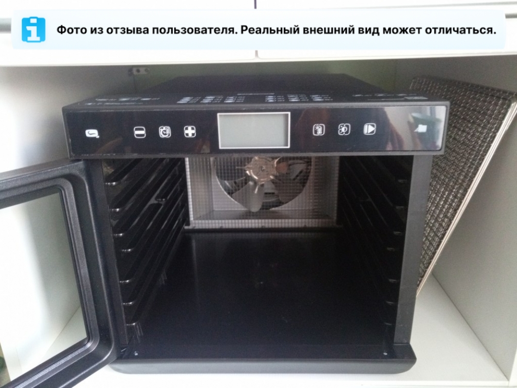 Мощный вентилятор в задней стенке корпуса – это важное условия для качественной и эффективной сушки. Лотки обдуваются теплым воздухом равномерно, и их не нужно менять местами (в отличие от круглых сушилок, например). Смешивания запахов удается избежать благодаря тому же горизонтальному обдуву.