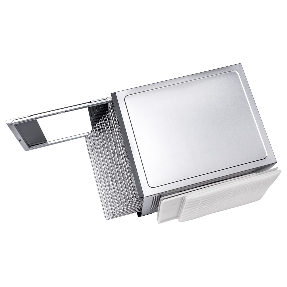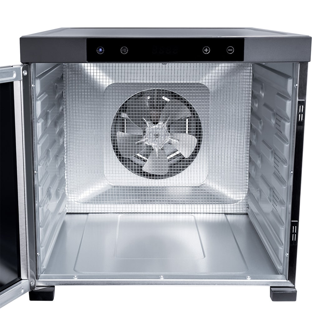 В профессиональной сушилке овощей и фруктов RAWMID DDP-10 вентилятор расположен на задней стенке корпуса. Благодаря горизонтальному потоку воздуха, продукты равномерно сушатся на всех 10 лотках. Кроме того, такой форм-фактор позволяет легко вынимать и вставлять любые лотки, проверяя готовность продукта.