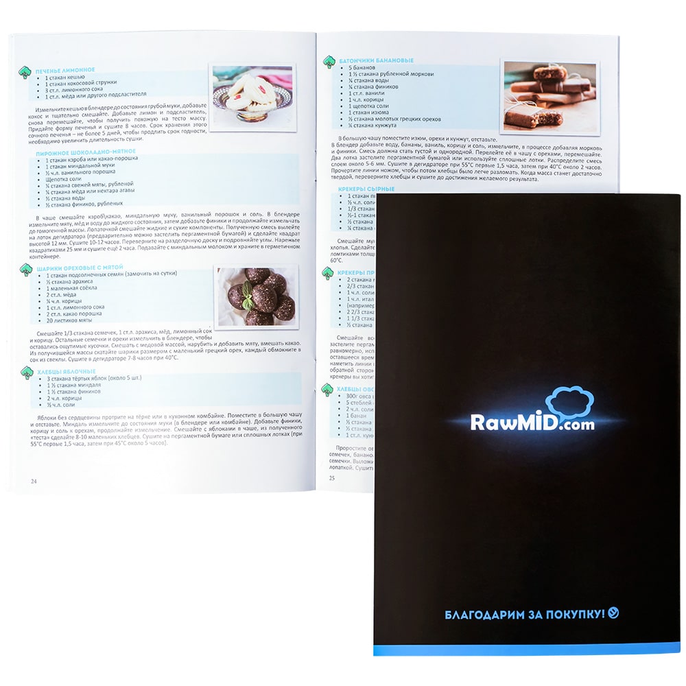 Благодаря съёмным лоткам, вы можете оставить произвольное расстояние между лотками и сушить продукцию разной формы и размеров. Например, гречневое печенье, капустный пирог, нутовые котлеты, миндально-кокосовое печенье с джемом из фиников и множество других необычных блюд, в том числе без термической обработки (при температуре не более 40°С).
