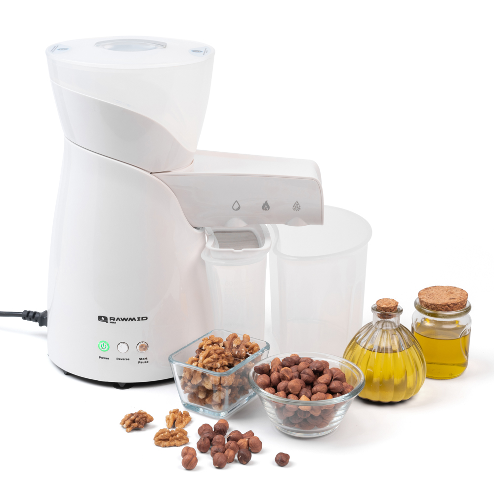 Маслопресс RAWMID Mini требует минимального участия владельца в процессе отжима масла. Нужно лишь загрузить сырьё в загрузочный бункер, закрыть крышку и включить прибор. Жмых и масло будут падать в подставленные контейнеры, при этом на контейнер для масла устанавливается сетчатый фильтр, отсеивающий частицы жмыха. Когда сырьё закончится и перестанет поступать в помольную камеру, маслопресс автоматически выключится.