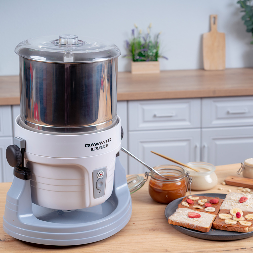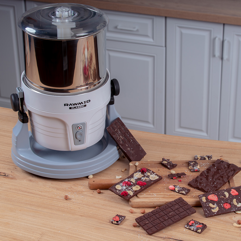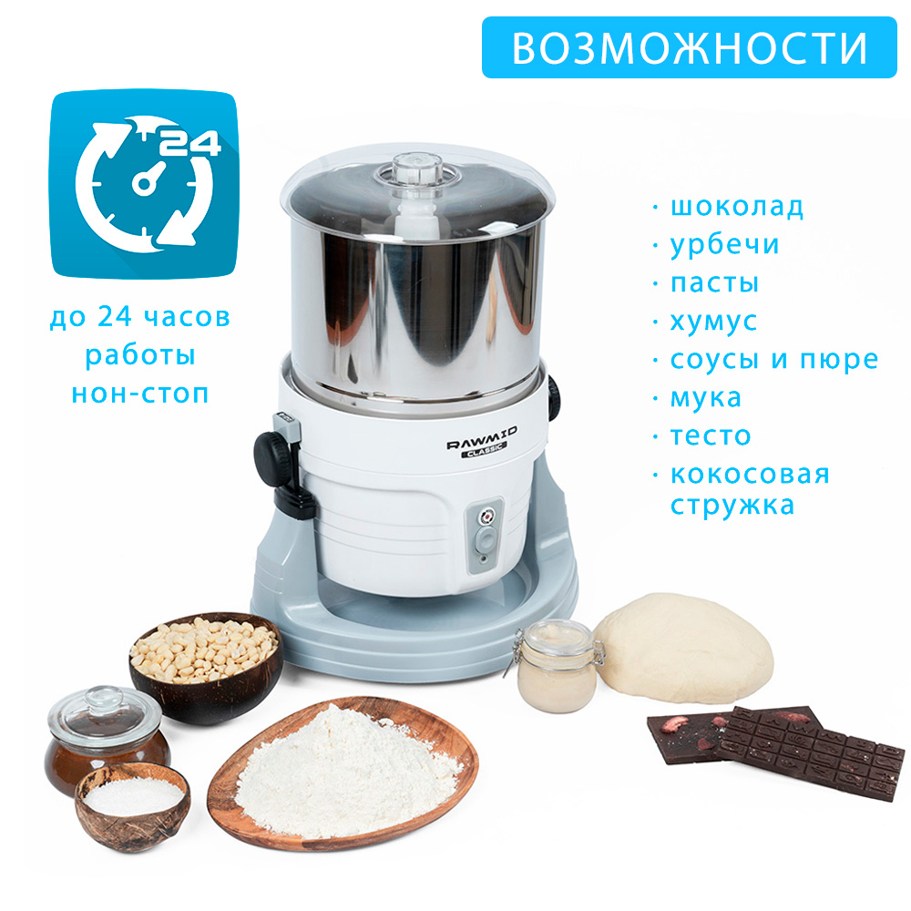 Меланжер RAWMID способен работать до 24 часов без остановки, чтобы приготовить правильный шоколад с коншированием или урбеч из твёрдых льняных семян.
