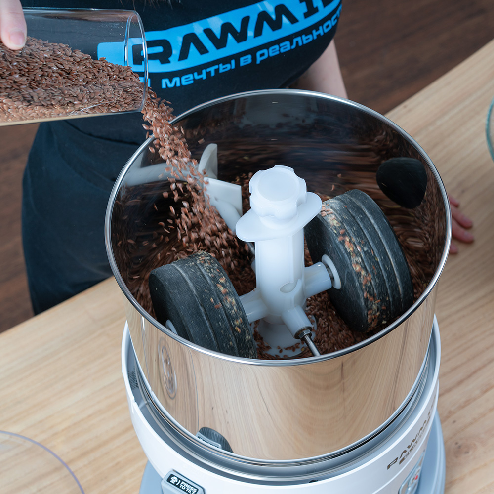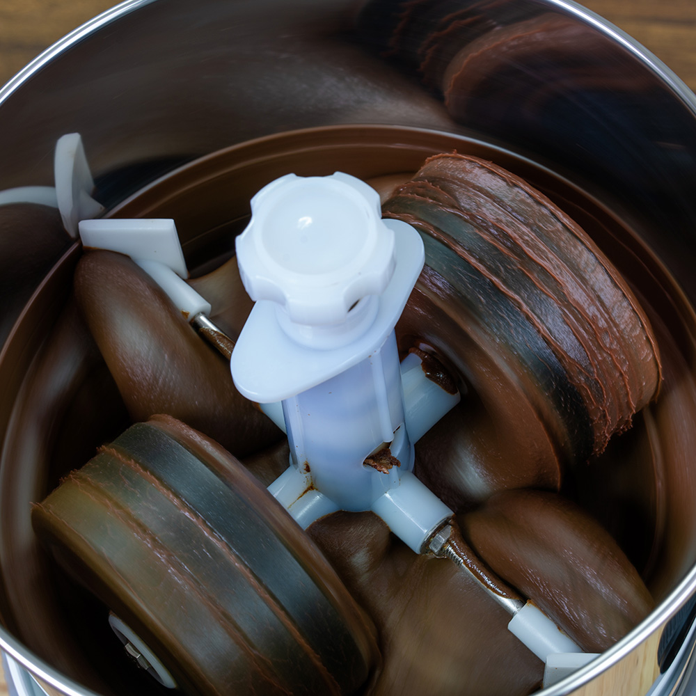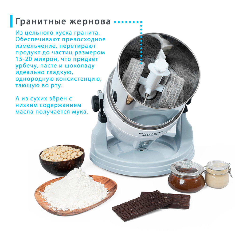 Жернова меланжера, изготовленные из натурального гранита, перетирают сырьё до мельчайших частиц размером 15-20 микрон и обеспечивают потрясающе нежную, идеально однородную консистенцию урбеча или шоколадной массы.
