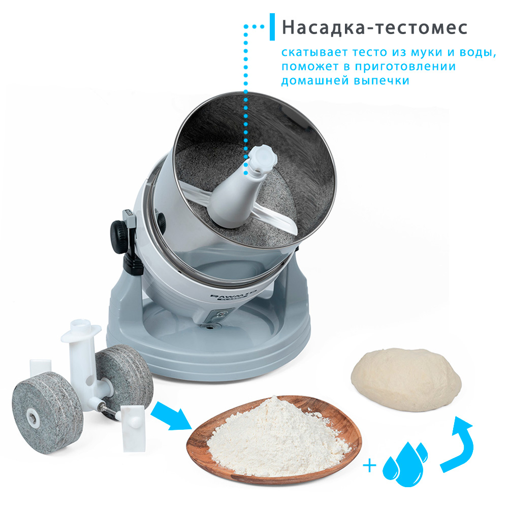С помощью насадки-тестомеса, входящей в комплект, можно приготовить тесто. Просто смешайте воду и муку. Муку, кстати, тоже можно приготовить в меланжере.