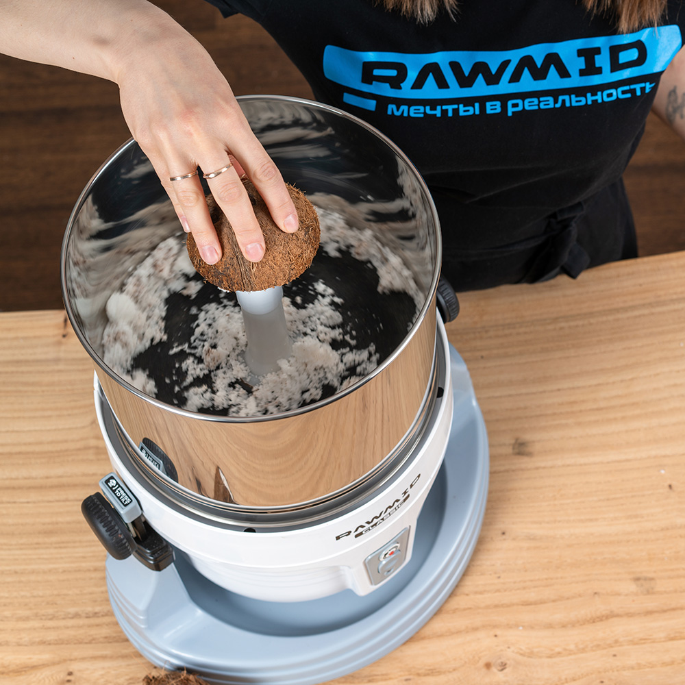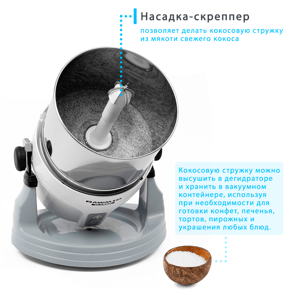 Специальная насадка-скреппер позволяет извлекать кокосовую стружку из свежего кокоса. Потом её можно высушить в дегидраторе и хранить в вакуумном контейнере, добавляя в торты, пирожные или шоколад. А ещё из высушенной кокосовой стружки получается прекрасный кокосовый урбеч.