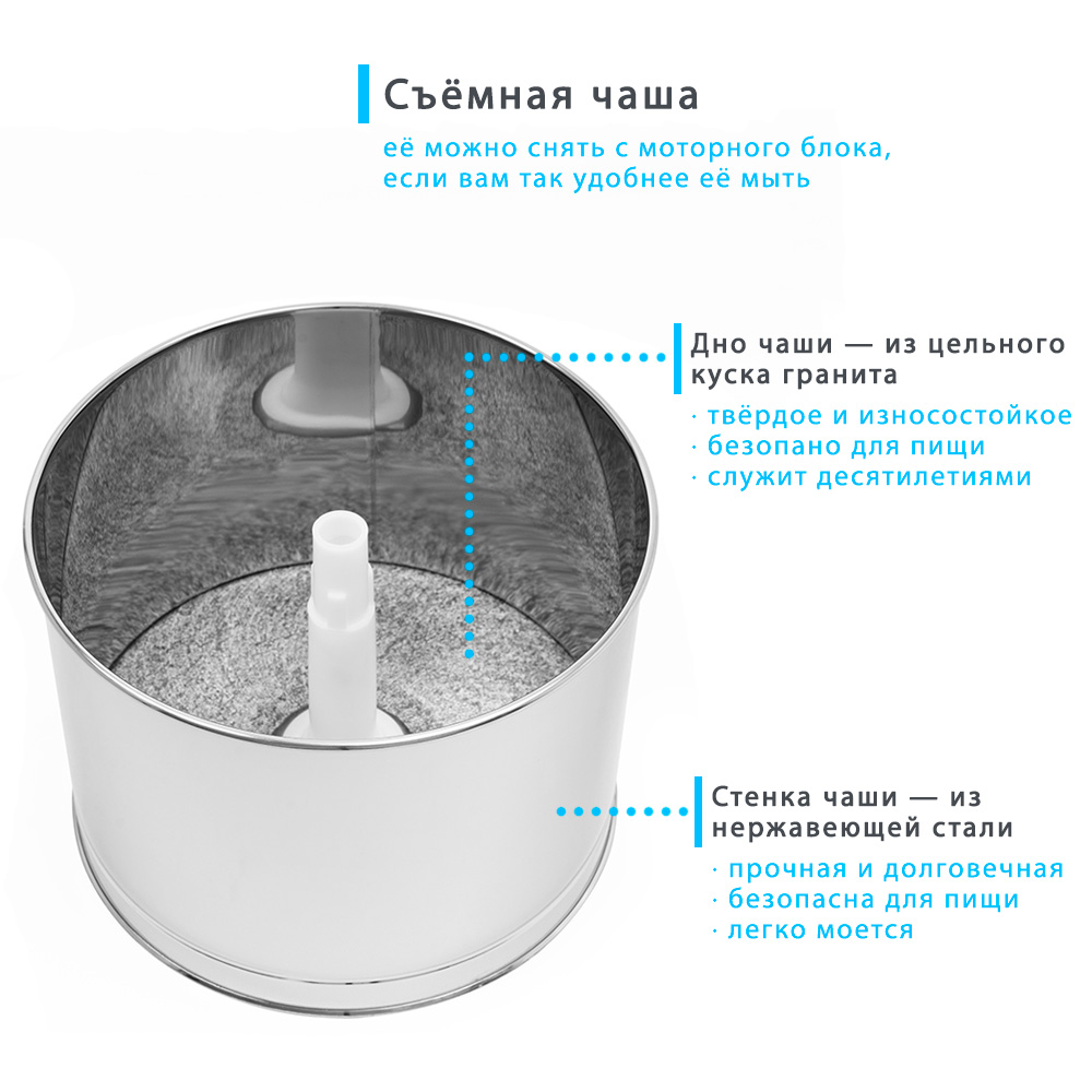 Чаша меланжера рассчитана на загрузку до 2 литров. Стенка чаши выполнена из пищевой нержавеющей стали, а дно чаши — из гранита, что гарантирует безопасность, экологичность и долговечность прибора.