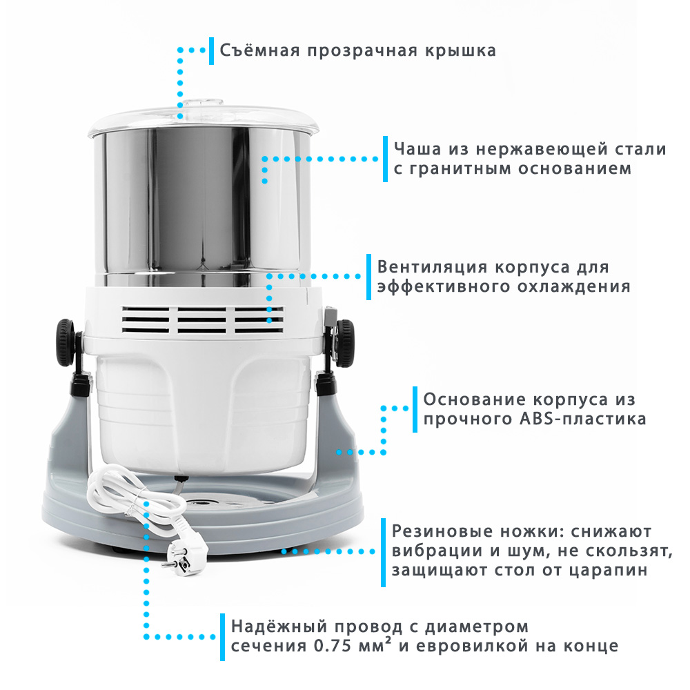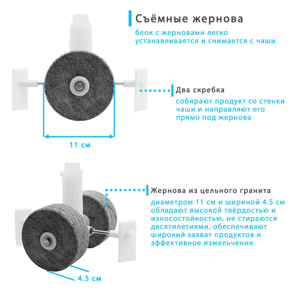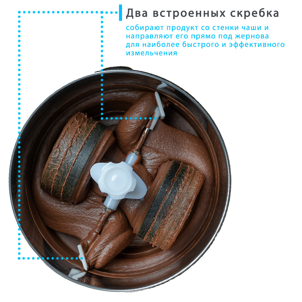 Внутри чаши установлены два скребка, которые собирают продукт со стенки и направляют его под жернова. Таким образом обеспечивается наиболее эффективное и быстрое измельчение продуктов.