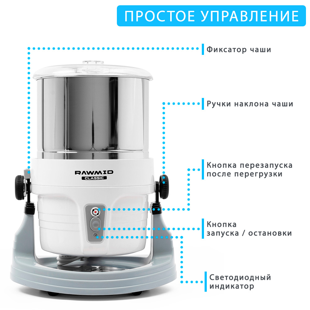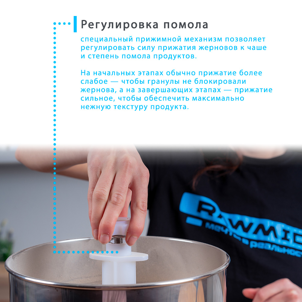 Специальный механизм позволяет регулировать силу прижатия жерновов ко дну чаши. Это помогает измельчать продукты более эффективно: на начальном этапе прижатие слабое, чтобы более крупные кусочки продуктов не мешали проворачиваться жерновам, а на последующих этапах — прижатие более сильное, чтобы обеспечить максимальное измельчение и добиться шелковистой текстуры готового продукта.