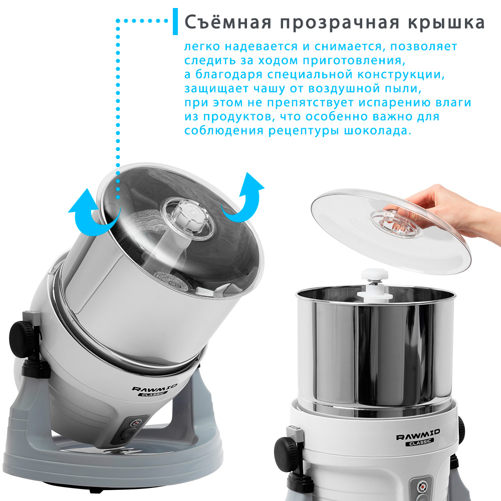 Прозрачная крышка чаши сконструирована так, чтобы защищать обрабатываемые продукты от воздушной пыли, но при этом не мешать влаге свободно испаряться, что важно для соблюдения правильности рецептуры шоколада и урбеча.